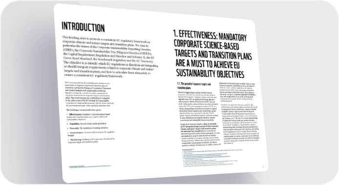 7 1. EFFECTIVENESS: MANDATORY CORPORATE SCIENCE-BASED TARGETS AND TRANSITION PLANS ARE A MUST TO ACHIEVE EU SUSTAINABILITY OBJECTIVES 6 https://actinitiative.org/ 7 Companies claiming to transition their operations in alignment with EU environmental goals (e.g. net zero emissions by 2050) but not doing it in practice or not in a timely manner . 8 https://actinitiative.org/. 9 https://www.unepfi.org/publications/banking-publications/practical-approaches-to-applying-the-eu-taxonomy-to-bank-lending/ 10 https://www.fsb-tcfd.org/webinar-proposed-guidance-on-climate-related-metrics-targets-and-transition-plans/ 11 https://www.efrag.org/Assets/Download?assetUrl=/sites/webpublishing/SiteAssets/Cover%20note%20for%20Batch%201%20WPs.pdf 12 https://www.climatebonds.net/principles-transition 13 https://www.ecb.europa.eu/press/key/date/2021/html/ecb.sp211020~03fba70983.en.html 14 Tangen, S. (2005), “Demystifying productivity and performance”, International Journal of Productivity and Performance Management, Vol. 54 No. 1, pp. 34-46. 15 Lara Tarquinio, Stefanía Carolina Posadas (2020) Exploring the term “non-financial information”: an academics’ view. 16 https://ec.europa.eu/info/business-economy-euro/company-reporting-and-auditing/company-reporting/corporate-sustainability-reporting_en 1.1. The ground of corporate targets and transition plans Climate strategies, plans or actions towards reducing companies’ emissions have existed since climate change is material for companies. Companies’ climate action has risen, especially when GHG accounting methodology appeared, such as in 2001 with the GHG protocol and ISO 14064 in 2006. Following this, sectoral pathways have been developed, such as the ICAO 2009 roadmap for aviation. At COP 2015, climate change pledges and actions have started to expand, and the first climate transition plan methodology appears aligned with the Paris Agreement 6 under the UNFCCC agenda. Targets and transition plans are gradually emerging in many international and regional initiatives, industry commitments and sustainability financial standards. Despite these numerous initiatives, there is currently no EU harmonised legal concept of what corporate climate and nature targets and transition plans are and what they should cover to ensure that the information provided enables market participants, investors, and regulators to properly assess the level of ambition and the credibility of a company’s strategy toward climate change and nature. Without such a harmonised framework, comparability and assessment are limited, and risks of transition-washing 7 will undermine our ability to achieve EU climate and environmental goals. Nowadays, there are many initiatives, standards, and guidelines such as ACT initiative 8 , UNEP FI 9 , TCFD 10 , EFRAG 11 , ISSB, SEC, CBI 12 ) that are generally used or will be used for producing sustainability reports and climate-related information. These initiatives discuss the concept of a corporate target and/or a transition plan, and recognise that it is one of the most important components of companies’ climate strategy (ECB 2021 communication 13 ). Therefore, it is important to determine explicitly what credible targets and transition plans are and how they should be assessed and used by stakeholders. A shared vocabulary is helpful to ensure a rigorous and robust development of sustainability financial information regarding climate targets and transition plans (Tangen, 2005 14 and Tarquinio and Posadas, 2020 15 ). The lack of a common understanding of targets and transition plans may produce confusion and opacity in contradiction with the transparency aimed by the CSRD 16 . In addition, a fragmentation in people’s understanding risks increasing costs and reporting burden, undermining the achievement of EU objectives, and leading to the fragmentation of the EU market. So far, WWF has analysed 18 initiatives discussing the concept of targets and transition plans (see Annex 1) and, based on this landscape of initiatives, developed an initial view of the five principles present in best practice corporate climate transition plans (see Annex 2). INTRODUCTION This briefing aims to promote a consistent EU regulatory framework on corporate climate and nature targets and transition plans. We raise in particular the issues of the Corporate Sustainability Reporting Directive (CSRD), the Corporate Sustainability Due Diligence Directive (CSDDD), the Capital Requirement Regulation and Directive and Solvency II, the EU Green Bond Standard, the Benchmark Regulation and the EU Taxonomy. The objective is to identify which EU regulations or directives are integrating or should integrate requirements related to corporate climate and nature targets and transition plans, and how to articulate them adequately to ensure a consistent EU regulatory framework. 5 https://finance.ec.europa.eu/publications/strategy-financing-transition-sustainable-economy_en. WWF recommends that the establishment, disclosure and supervision of corporate targets and transition plans be mandatory and that the European Commission, Parliament and Council integrate such requirements in relevant legislative proposals, in order to create a consistent EU regulatory framework on corporate targets and transition plans. This would increase the contribution of companies to the achievement of the EU Strategy for Financing the Transition to a Sustainable Economy 5 , the EU Green Deal and EU environmental goals, while managing transition risks. The briefing is structured in five parts: • Effectiveness: Mandatory corporate science-based targets and transition plans are a must to achieve EU sustainability objectives • Feasibility: Several robust market precedents • Necessity: The limitations of existing initiatives • Concreteness: Overview of the necessary EU regulatory changes • Monitoring: Building an EU supervisory framework for corporate targets and transition plans.