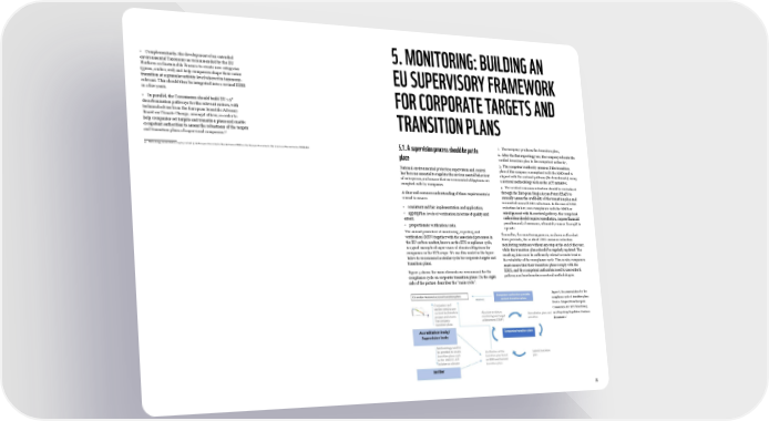 25 • Complementarily, the development of an extended environmental Taxonomy as recommended by the EU Platform on Sustainable Finance to create new categories (green, amber, red) and help companies shape their entire transition at a granular activity level where it is taxonomy- relevant. This should then be integrated into a revised ESRS in a few years. • In parallel, the Commission should build EU 1.5° decarbonisation pathways for the relevant sectors, with technical advice from the European Scientific Advisory Board on Climate Change, amongst others, in order to help companies set targets and transition plans and enable competent authorities to assess the robustness of the targets and transition plans of supervised companies. 57 57 Methodology standardisation may be provided by the European Committee for Standardization (CEN) and the European Committee for Electrotechnical Standardization (CENELEC). 5. MONITORING: BUILDING AN EU SUPERVISORY FRAMEWORK FOR CORPORATE TARGETS AND TRANSITION PLANS 5.1. A supervision process should be put in place National environmental protection supervision and control has become essential to regulate the environmental behaviour of enterprises, and ensure that environmental obligations are complied with by companies. A clear and common understanding of these requirements is crucial to ensure: • consistent and fair implementation and application; • appropriate levels of verification in terms of quality and extent; • proportionate verification costs. The annual procedure of monitoring, reporting and verification (MRV) together with the associated processes in the EU carbon market, known as the ETS compliance cycle, is a good example of supervision of climate obligations for companies in the ETS scope. We use this model in the figure below to recommend a similar cycle for corporate targets and transition plans. Figure 5 shows the main elements we recommend for the compliance cycle on corporate transition plans. On the right side of the picture describes the “main cycle”: 1. The company produces the transition plan; 2. After the first reporting year, the company submits the verified transition plan to the competent authority; 3. The competent authority assesses if the transition plan of the company is compliant with the ESRS and is aligned with the sectoral pathway (the benchmark), using a sectoral methodology such as the ACT initiative; 4. The verified emission reduction should be centralised through the European Single Access Point (ESAP) to annually assess the credibility of the transition plan and committed annual GHG reductions. In the case of GHG reduction failure, non-compliance with the ESRS or misalignment with the sectoral pathway, the competent authorities should require remediation, impose financial penalties and, if necessary, ultimately remove the right to operate. Thereafter, the monitoring goes on, as shown in the chart. More precisely, the verified GHG emission reduction monitoring continues without any stop at the end of the year, while the transition plans should be regularly updated. The resulting data must be sufficiently robust to create trust in the reliability of the compliance cycle. This is why companies must ensure that their transition plans comply with the ESRS, and the competent authorities need to use sectoral pathways as benchmarks in sectoral methodologies. Figure 5: Recommendation for the compliance cycle of transition plans Source: Adapted from European Commission EU ETS ‘Monitoring and Reporting Regulation Guidance Document 1’