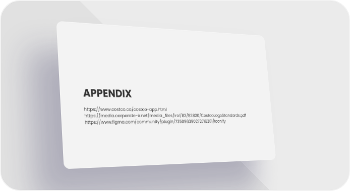 APPENDIX https://www.costco.ca/costco-app.html https://media.corporate-ir.net/media_files/irol/83/83830/CostcoLogoStandards.pdf https://www.figma.com/community/plugin/735098390272716381/Iconify