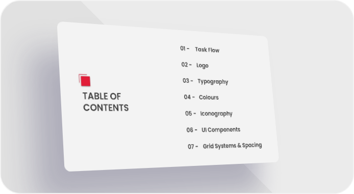 01 - Task Flow 02 - Logo 03 - Typography 04 - Colours TABLE OF CONTENTS 05 - Iconography 06 - UI Components 07 - Grid Systems & Spacing