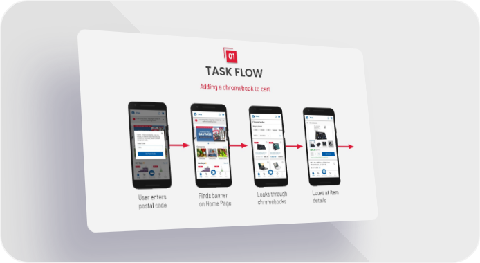 01 01 TASK FLOW Adding a chromebook to cart User enters Finds banner Looks through Looks at item postal code on Home Page chromebooks details