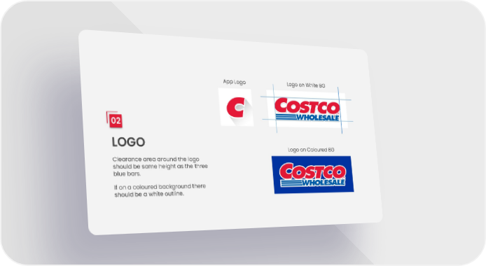 Costco Brand Book Page 4 Page 6App Logo Logo on White BG 02 LOGO Logo on Coloured BG Clearance area around the logo should be same height as the three blue bars. If on a coloured background there should be a white outline.