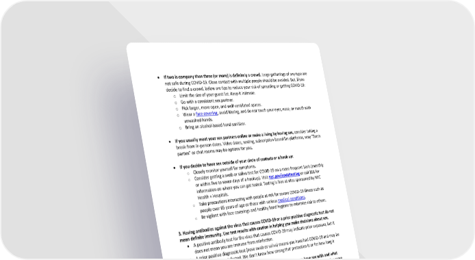 • If two is company then three (or more) is definitely a crowd. Large gatherings of any type are not safe during COVID-19. Close contact with multiple people should be avoided. But, if you decide to find a crowd, below are tips to reduce your risk of spreading or getting COVID-19: o Limit the size of your guest list. Keep it intimate. o Go with a consistent sex partner. o Pick larger, more open, and well-ventilated spaces. o Wear a face covering, avoid kissing, and do not touch your eyes, nose, or mouth with unwashed hands. o Bring an alcohol-based hand sanitizer. • If you usually meet your sex partners online or make a living by having sex, consider taking a break from in-person dates. Video dates, sexting, subscription-based fan platforms, sexy “Zoom parties” or chat rooms may be options for you. • If you decide to have sex outside of your circle of contacts or a hook up: o Closely monitor yourself for symptoms. o Consider getting a swab or saliva test for COVID-19 on a more frequent basis (monthly or within five to seven days of a hookup). Visit nyc.gov/covidtesting or call 311 for information on where you can get tested. Testing is free at sites sponsored by NYC Health + Hospitals. o Take precautions interacting with people at risk for severe COVID-19 illness such as people over 65 years of age or those with serious medical conditions. o Be vigilant with face coverings and healthy hand hygiene to minimize risk to others. 3. Having antibodies against the virus that causes COVID-19 or a prior positive diagnostic test do not mean definite immunity. Use test results with caution in helping you make decisions about sex. • A positive antibody test for the virus that causes COVID-19 may indicate prior exposure, but it does not mean you are immune from reinfection. • A prior positive diagnostic test (nose swab or saliva) means you have had COVID-19 and may be less likely to be re-infected. We don’t know how strong that protection is or for how long it lasts. • Be cautious in using these tests to make decisions about who you have sex with and what kind of sex you have since antibody test results are not definite proof of immunity. For more information about COVID-19 tests and how to interpret results, visit nyc.gov/health/coronavirus and look for COVID-19 Testing: Frequently Asked Questions. 4. Take care during sex. • Kissing can easily pass the virus. Avoid kissing anyone who is not part of your small circle of close contacts. • Rimming (mouth on anus) might spread the virus. Virus in feces may enter your mouth and could lead to infection. • Wear a face covering or mask. Maybe it’s your thing, maybe it’s not, but during COVID-19 wearing a face covering that covers your nose and mouth is a good way to add a layer of 2