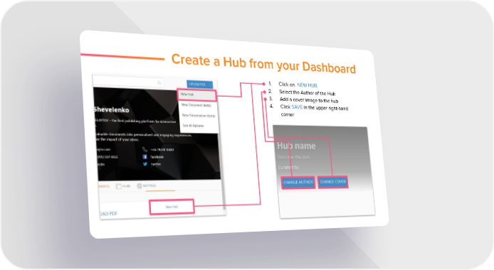 Creating a Hub Page 1 Page 3Create a Hub from your Dashboard 1. Click on NEW HUB 2. Select the Author of the Hub 3. Add a cover image to the hub 4. Click SAVE in the upper right-hand corner