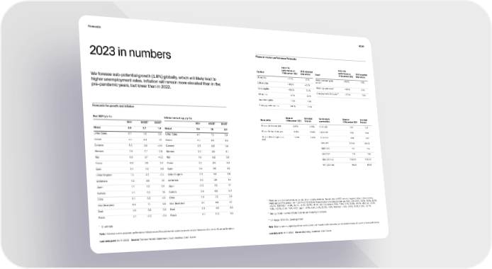 Forecasts 60 | 61 2023 in numbers Financial market performance/forecasts 2022 YTD 2022 YTD performance on 2023 expected performance on 2023 expected Equities* 10 November 2022 total returns Credit 10 November 2022 total returns US equities –17.1% 2.0% Global investment grade –15.6% 4.6% We foresee sub-potential growth (1.6%) globally, which will likely lead to bonds** EMU equities –10.8% – 2.0% higher unemployment rates. Inflation will remain more elevated than in the Global high yield bonds** –13.4% 5.1% Swiss equities –13.0% 5.0% pre-pandemic years, but lower than in 2022. Emerging market HC bonds*** – 21.2% 7.6% UK equities 5.7% 3.0% Japanese equities –1.3% 1.5% Emerging market equities –19.7% 1.0% Forecasts for growth and inflation Close on End-2023 Currencies & Close on End-2023 Real GDP (y/y %) Inflation (annual avg. y/y %) Bond yields 10 November 2022 forecast commodities 10 November 2022 forecast 2021 2022E* 2023E* 2021 2022E* 2023E* 10-year US Treasury yield 3.81% 4.10% EUR/USD 1.02 1.02 Global 5.9 2.7 1.6 Global 3.5 7.6 5.0 10-year German Bund yield 2.01% 2.80% USD/CHF 0.96 0.95 United States 5.7 1.6 0.8 United States 4.7 7.9 3.8 10-year Swiss Eidgenossen 1.07% 1.40% EUR/CHF 0.98 0.97 Canada 4.4 3.4 1.0 Canada 3.4 6.9 3.8 yield USD/JPY 141.00 135.00 Eurozone 5.3 3.2 – 0.2 Eurozone 2.6 8.6 6.0 GBP/USD 1.17 1.14 Germany 2.9 1.7 – 0.8 Germany 3.2 8.5 6.4 USD/CNY 7.19 7.30 Italy 6.6 3.7 – 0.2 Italy 1.9 8.2 6.0 Gold (USD/oz) 1755.00 1750.00 France 6.8 2.5 0.2 France 2.1 6.0 4.8 WTI (USD/bbl) 86.00 80.00 Spain 5.1 4.6 0.8 Spain 2.9 9.0 4.6 United Kingdom 7.4 4.2 – 0.4 United Kingdom 2.6 9.0 6.6 Switzerland 4.2 2.2 1.0 Switzerland 0.6 2.9 1.5 Japan 1.7 1.0 0.5 Japan – 0.2 2.2 1.7 Australia 4.7 4.0 1.6 Australia 2.8 6.6 5.2 China 8.1 3.3 4.5 China 0.9 2.2 2.0 India (fiscal year) 8.3 7.1 5.8 India (fiscal year) 5.1 6.8 5.1 * P erformance and expected returns are total return including dividends. Markets refer to MSCI country / regional indices in local currency. Performance of the periods. 10/11/2017–10/11/2022 for those indices in chronological order are: MSCI USA: 9.5%, 13.6%, 18.6%, 33.5%, Brazil 4.6 2.9 0.9 Brazil 8.3 9.3 5.0 –15.4%. MSCI EMU: – 5.9%, 15.4%, – 3.5%, 29.2%, –11.4%. MSCI Switzerland: 2.9%, 17.9%, 2.7%, 23.9%, –10.1%. MSCI UK: – 0.3%, 7.8%, –13.1%, 21.3%, 7.0%. MSCI Japan: – 4.6%, 5.8%, 2.9%, 22.3%, –1.5%. MSCI EM: – 7.9%, 12.6%, 15.0%, 11.0%, – 21.7%. Russia 4.7 – 4.0 – 2.5 Russia 6.7 14.2 4.5 ** Barclays Global Investment Grade Corporate and Global High Y ield index * E: estimate *** JP Morgan EMBIG Div. (sovereign index) Note: Historical and/or projected performance indications and financial market scenarios are not reliable indicators of current or future performance. Note Historical and/or projected performance indications and financial market scenarios are not reliable indicators of current or future performance. Last data point 10/11/2022 Source Thomson Reuters Datastream, Haver Analytics, Credit Suisse Last data point 10/11/2022 Source Bloomberg, Datastream, Credit Suisse