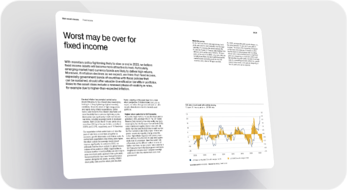 Main asset classes Fixed income 28 | 29 Watch the curves For 2023, we expect the yield curve to steepen, i.e., As the Fed hiked interest rates aggressively, bond the spread between 10-year and 2-year yields to Worst may be over for yields rose more for short maturities than for longer increase. The extent of this steepening will depend maturities. For example, the spread between the on the macro circumstances. A scenario in which 10-year and 2-year US Treasury yields declined from the Fed reacts to rising recession risks by cutting +80 basis points at the start of 2022 to –50 basis interest rates would most likely lead to a significant fixed income points at the end of Q3 2022. Long-term yields are yield curve steepening, as short-term yields would currently lower than short-term yields because the fall more than long-term yields. But even in our base market expects economic growth to slow and case of a normalizing economic outlook (i.e., growth monetary policy rates to fall again over time. remains below trend), some gradual steepening of the US yield curve can be expected. With monetary policy tightening likely to slow or end in 2023, we believe fixed income assets will become more attractive to hold. Particularly, emerging market hard currency bonds are likely to deliver high returns. Moreover, if inflation declines as we expect, we think that fixed income, especially government bonds of countries with fiscal policies that can be sustained, should offer valuable diversification benefits in portfolios. Risks to the asset class include a renewed phase of volatility in rates, for example due to higher-than-e xpected inflation. Elevated inflation has prompted central banks higher, weighing on the asset class from a total around the globe to hike interest rates meaningfully, return perspective. If inflation indeed cools, as we leading to a sharp tightening of global monetary expect, we believe that government bonds will offer US rates should peak with activity slowing conditions. Given the shock of high energy prices valuable diversification benefits for multi-asset 10-year US Treasury yields vs. US ISM index and rapidly rising inflation expectations, central portfolios. banks were forced to hike interest rates faster and 3.0 more forcefully than in previous tightening cycles. Higher return potential in US Treasuries 25 Bond yields rose significantly in both nominal and Across the major markets, we see the most duration 2.5 real terms, including sovereign bonds in developed potential in USD, and less in EUR. The US Federal 20 2.0 markets. Both US and Bund 10-year yields are up Reserve (Fed) started to hike rates earlier and more more than 200 bp in the year to date, currently at meaningfully than the European Central Bank (ECB), 15 1.5 3.81% and 2.01%, respectively, as of 10 November. which maintained negative interest rates until July 2022. Not only does the ECB have to catch up now, 10 1.0 Our expectation is that central banks will slow the but the Eurozone is also facing higher inflation and 0.5 pace of rate hikes or end hikes altogether as greater uncertainty regarding energy prices this 5 economic growth deteriorates and inflation cools. As winter. High inflation together with currency weak- 0.0 central bank expectations stop driving yields higher, ness will likely force the ECB to raise rates aggres- 0 the return outlook for sovereign bonds should sively even in a recession. Given the current rate – 0.5 improve significantly. In contrast to 2022, we differentials and the different outlook in terms of – 5 –1.0 anticipate that the return outlook for global treasury further rate hikes, we see greater return potential in indices will be positive in 2023. Opportunities to US Treasuries than in Eurozone government bonds. –10 –1.5 increase duration in bond portfolios are also likely to Heightened concerns about European sovereign – 2.0 arise once bond yields approach their cycle peaks. debt could make this relative move even more –15 Government bonds have seen their performance pronounced. – 2.5 weaken alongside risk assets, as rising inflation 2008 2010 2012 2014 2016 2018 2020 2022 drove policy rates and the whole yield structure US Treasuries 10y yield (12-month changes, rhs, %) US ISM (12-month changes, index) Last data point 31/10/2022 Source Bloomberg, Credit Suisse