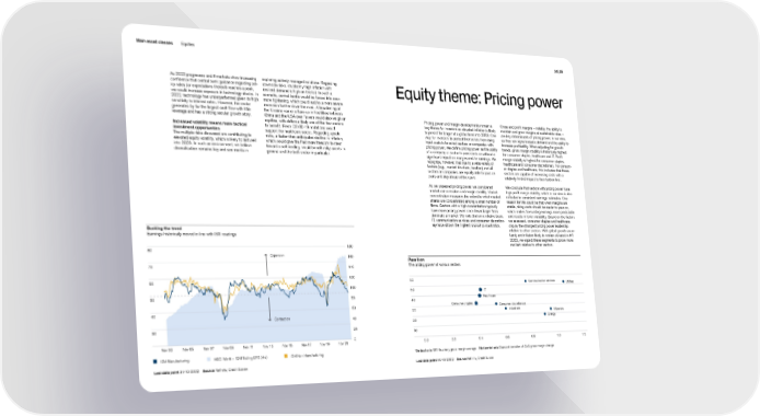 Main asset classes Equities 34 | 35 As 2023 progresses and if markets show increasing exploring actively managed solutions. Regarding confidence that central bank guidance regarding pol- downside risks, stubbornly high inflation with icy rates (or expectations thereof) reaches a peak, resilient demand is high on the list. In such a Equity theme: Pricing power we would increase exposure in technology stocks. In scenario, central banks would be forced into even 2022, technology has underperformed given its high more tightening, which could lead to a more severe sensitivity to interest rates. However, the sector recession further down the road. A broadening of generates by far the largest cash flow with little the Ukraine war or a flare-up in hostilities between leverage and has a strong secular growth story. China and the USA over Taiwan would also weigh on Pricing power and margin developments remain a Gross and profit margins – notably, the ability to equities, with defense likely one of the few sectors key theme for investors as elevated inflation is likely maintain and grow margins at sustainable rates – Increased volatility means more tactical to benefit. Fresh COVID-19 mutations would to persist for longer at a global level into 2023. One are key determinants of pricing power, in our view, investment opportunities support the healthcare sector. Regarding upside way for investors to protect themselves from rising as they can signal inelastic demand and the ability to The multiple risks discussed are contributing to risks, a faster-than-anticipated decline in inflation, input costs is to select sectors or companies with increase profitability. When adjusting for growth elevated equity volatility, which is likely to last well which would give the Fed more freedom to steer pricing power. We define pricing power as the ability trends, gross margin stability is historically highest into 2023. In such an environment, we believe toward a soft landing, would benefit risky assets in of a company or sector to pass costs on without a for consumer staples, healthcare and IT. Profit diversification remains key and see merits in general and the tech sector in particular. significant impact on margins and/or earnings. We margin stability is highest for consumer staples, recognize, however, that due to a wide variety of healthcare and consumer discretionary. For consum- factors (e.g., market structure, location), not all er staples and healthcare, this indicates that these sectors or companies are equally able to pass on sectors are capable of increasing costs with a costs and stay ahead of the curve. relatively limited impact to their bottom line. As we assessed pricing power, we considered We conclude that sectors with pricing power have market concentration and margin stability. Market high profit margin stability, which in our view is also concentration measures the extent to which market reflected in consistent earnings estimates. One shares are concentrated among a small number of reason for this could be that when margins are firms. Sectors with a high concentration typically stable, rising costs should be easier to pass on, have more pricing power since fewer larger firms which makes forecasting earnings more predictable dominate a market. We note that on a relative basis, and results in lower variability. Based on the factors IT, communication services and consumer discretion- we assessed, consumer staples and healthcare ary have shown the highest market concentration. display the strongest pricing power leadership Bucking the trend relative to other sectors. With global growth uncer- Earnings historically moved in line with ISM readings tainty and inflation likely to remain elevated in H1 2023, we expect these segments to prove more 180 180 resilient relative to other sectors. 80 160 Expansion 160 Pass it on 70 140 The pricing power of various sectors 140 120 120 60 60 Communication services 100 100 Utilities 50 IT 50 80 Healthcare 80 40 60 60 Consumer staples Consumer discretionary 40 30 Industrials Materials 40 Contraction 40 Energy 20 30 20 20 10 0 0 Nov 03 Nov 05 Nov 07 Nov 09 Nov 11 Nov 13 Nov 15 Nov 17 Nov 19 Nov 21 0.0 0.2 0.4 0.6 0.8 1.0 1.2 ISM Manufacturing MSCI World – 12M Trailing EPS (rhs) ISM Non-Manufacturing Vertical axis 10Y Quarterly gross margin average Horizontal axis Standard deviation of QoQ gross margin change Last data point 31/10/2022 Source Refinitiv, Credit Suisse Last data point 06/10/2022 Source Refinitiv, Credit Suisse