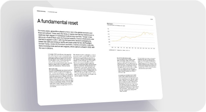 Global economy A fundamental reset 14 | 15 Past the peak A fundamental reset Global trade (goods and services) in % of GDP 70% 60% For many years, geopolitics played a minor role in the global economic and 50% financial outlook. These were the times of stable international relations and a 40% relatively high degree of multilateral trust among countries. Though crises did occur, most of them were for financial reasons. Cracks in that world order 30% started to appear in 2017, with the first economic tensions emerging be- 20% tween the USA and China on tariffs and trade under former US President 10% Donald Trump. Under US President Joe Biden, rivalries evolved to confronta- tions involving more sectors and regions, which came to a head in 2022 with 1960 1964 1968 1972 1976 1980 1984 1988 1992 1996 2000 2004 2008 2012 2016 2020 the war in Ukraine. Last data point 2021 Source Haver Analytics, Credit Suisse In hindsight, 2022 marks the year when geopolitics After decades of growth in global trade as a share of took center stage once again, not only significantly global gross domestic product (GDP), the volume of impacting the global economy and financial markets, goods and services exchanged as a percentage of Out with the old monetary regime This has prompted us to increase our forecasts for but resetting international relations and commerce GDP peaked in 2008 and has fluctuated in a range 2022 also marked the end of “lowflation,” a side central bank policy rates in all major economies for many years to come. This has implications for between 50% and 60% ever since. The COVID-19 effect of globalization. Indeed, COVID-related except China. We now expect the fastest pace of short-, medium- and long-term growth, price pandemic and, more recently, political sanctions, disruptions of global supply chains, more decisive tightening on a 12-month basis and of the largest prospects and monetary and fiscal policy, potentially have forced companies to prioritize supply chain climate policy action and a full-fledged energy crisis magnitude globally since 1979. Although we expect leading to sizable shifts in the global monetary resilience over prices since 2020, which has changed and food price shock in the wake of the Ukraine war the pace of tightening to peak by end-2022, we do system with reverberations in financial markets. trade flows substantially. International trade is now led to a new regime of elevated inflation. Not only not forecast any developed market central bank to reorganizing in closer alignment with geo political did volatile energy and food prices drive up headline cut interest rates in 2023, as they are focused on New world order alliances, and a shift toward repatriation and domes- inflation, but wage increases also allowed less actual rather than expected inflation. The world of multilateralism and strong mutual trust tic development has started for strategic sectors. We volatile price categories like travel, hospitality and between countries and governments came to an believe this trend will continue for at least the next medical services to rise, lifting core inflation to end – or at the very least paused – in 2022. Deep 2–5 years until potential political change in various multi-decade highs. and persistent fractures emerged in the geopolitical parts of the world may bring a different political and world order, giving rise to a multipolar world that we economic agenda in focus again. Central banks saw themselves forced to tighten believe is likely to last for years. The global West monetary policy in bigger increments and more (Western developed countries and allies) has drifted swiftly than expected, thus ending the phase of low away from the global East (China, Russia and allies) or even negative interest rates. Although we believe in terms of core strategic interests, while the global inflation is peaking in most countries as a result of South (Brazil, Russia, India and China and most decisive monetary policy action, central banks are developing countries) is reorganizing to pursue its signaling that they need to hike rates further to own interests. reduce demand and create slack in labor markets. One reason for this is that price increases have broadened from a limited group of supply shocks to widespread inflation. Crucially, tight labor markets and higher wage growth risk making broader inflation persistent.