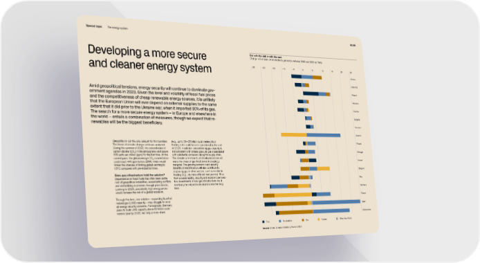 Special topic The energy system 54 | 55 Out with the old, in with the new Developing a more secure Change in European Union electricity generation between 2019 and 2021 (in TWh) and cleaner energy system – 25 – 20 –15 –10 – 5 0 5 10 15 20 25 Greece Other EU Amid geopolitical tensions, energy security will continue to dominate gov- Poland ernment agendas in 2023. Given the level and volatility of fossil fuel prices and the competitiveness of cheap renewable energy sources, it is unlikely Romania that the European Union will ever depend on external supplies to the same extent that it did prior to the Ukraine war, when it imported 90% of its gas. Czechia The search for a more secure energy system – in Europe and elsewhere in Bulgaria the world – entails a combination of measures, though we expect that re- newables will be the biggest beneficiary. Denmark Sweden Geopolitics is not the only catalyst for this transition. (e.g., up to 20 – 25 billion cubic meters) from Finland The threat of climate change continues unabated. floating units could become operational by the end During the summer of 2022, the concentration of of 2023. In addition, overextending gas capacity is carbon dioxide (CO2) in the atmosphere went above not consistent with climate goals, as gas is associated Portugal 420 parts per million (ppm) for the first time. At the with substantial emissions along the supply chain. current pace, the global average CO concentration The climate commitments of developed nations will 2 Ireland could reach 440 ppm before 2030, which would make the share of gas-fired power increasingly hinder the chances of limiting global warming to marginal. The growing economic and security 1.5°C compared with pre-industrial times. benefits of electrification will also contribute to Belgium displacing gas in other sectors, such as residential Does gas infrastructure hold the solution? heating (e.g., via more efficient heat pumps). Thus, Dependence on fossil fuels has often been at the from a sustainability, security and economic perspec- Italy root of geopolitical instabilities, exacerbating conflicts tive, investments in new gas infrastructure could and destabilizing economies through price shocks. eventually be subject to devaluation over the long Looking to 2023, persistently high energy prices term. Germany would increase the risk of a global recession. Through this lens, one solution – expanding liquefied France natural gas (LNG) capacity – may struggle to solve all energy security concerns. For example, Germany plans to build LNG capacity above 60 billion cubic Spain meters/year by 2026, but only a minor share Netherlands Coal Renewables Gas Nuclear Other fossil fuels Source Ember, European Electricity Review 2022