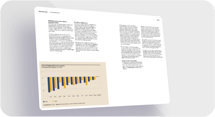 Global economy A fundamental reset 18 | 19 Challenging environment in 2023 in The USD in a divided world In the longer term, however, the resetting of Although we expect this downturn to end and the developed markets As long as the rhetoric of the US Federal Reserve international relations may lead to new develop- recovery to resume in 2024, we also see lasting Governments are introducing support measures and (Fed) remains hawkish, the USD should enjoy ments in the global monetary system. Today’s damage to economic structures. The pandemic has increasing public spending to address current continued support, with USD strength tightening USD-based monetary system, with most global combined with demographic trends to weaken the politically induced challenges. In many developed monetary policy globally. To prevent currency trade denominated in USD and 90% of all currency outlook for labor supply. Geopolitical ruptures are countries, budget deficits are already running at 4% depreciation from exacerbating imported inflation, transactions having one USD leg, is still a reflection weighing on trade and leading to persistently weaker or higher in 2022 and are unlikely to improve materi- the European Central Bank will need to keep pace of the post-World War II era. This system has gone business investment. In China, the policy shift back ally in 2023. with the Fed even though the Eurozone faces through one big reform (from the gold standard to to a state-driven growth model will likely erode the recession. Weakness in the JPY looks increasingly flexible exchange rates), involved change in the outlook for productivity growth. As became apparent in the UK after the new likely to force the Bank of Japan to shift away from monetary policy setting (from targeting money government announced an expansionary mini- its current easing bias to allow Japanese yields to supply to targeting inflation to quantitative easing) Taken together, we have cut our longer-term growth budget (which was later scrapped), financial markets rise. Moreover, continued USD strength is likely to and seen reforms in the monetary reserve policies forecasts for all the major economies. For the USA, are quick to reject unsustainable fiscal policy, pull capital from emerging markets. and tools (from reserves to the introduction of swap we forecast an average real GDP growth rate of especially when it comes on top of unsustainable lines between key central banks). However, it has 1.5% over a five-year horizon, significantly below the external balances, i.e., a high current account deficit. With the real trade-weighted USD already at its never been challenged. average growth of 2.2% for the 2010 – 2019 period. As a result, governments will over time either resort strongest level since 1985, it seems reasonable to For the Eurozone, we forecast an average growth to tax increases to finance permanent increases in expect the currency to peak and potentially lose The new multi polar world and the resetting of rate of 1.1% and for China growth of 4.4%. defense expenses and support programs, or risk some ground in the latter part of 2023. Yet this will international trade may well, over time, lead to the large public debt increases. In highly indebted likely require the Fed to signal an end to its tight- emergence of two parallel monetary systems: the On a positive note, the major central banks appear countries, sovereign bond yields will therefore again ening and some signs of economic recovery outside current USD-based system as well as a yet-to-be committed to returning inflation rates close to their be at risk of rising sharply. the USA. conceived alternative system bypassing the USD. 2% targets. Inflation may remain above target in The degree to which this may influence foreign 2023, but should return close to target from 2024. demand for the USD as a reserve currency and for However, the cost of achieving this will be per- US government bonds as reserve assets will sistently higher interest rates and lower trend growth. determine the future of the USD. Long-term outlook: Lower growth The energy shock to Europe from Russia’s invasion of Ukraine and the growth recession in China have hurt the post-pandemic outlook. The Eurozone is In the red: Budget deficits across countries likely in recession and the USA, though still growing Overall government balances in % of GDP slightly in our baseline forecast, is at high risk of recession. 4 0 – 4 – 8 India China Japan Brazil Italy France Spain UK USA Germany Russia Switzerland 2022 2023 Last data point 10/2022 Source International Monetary Fund (IMF) forecast as of October 2022
