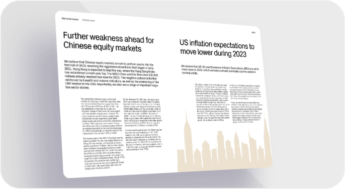 Main asset classes Technical corner 40 | 41 Further weakness ahead for US inflation expectations to Chinese equity markets move lower during 2023 We believe that Chinese equity markets are set to perform poorly into the We believe that US 10-year Breakeven Inflation Expectations (BEIs) are set to first half of 2023, resuming the aggressive downtrend that began in early move lower in 2023, which we believe should eventually cap the upside in 2021. Hong Kong is expected to lead the way, where the Hang Seng Index nominal yields. has established a multi-year top. The MSCI China and the Shenzhen CSI 300 indexes already reached new lows for 2022. This negative outlook is further reinforced by breadth and volume indicators, as well as the weakening of the This outlook is based on the confirmation of a large A major top in US inflation expectations is expected CNY relative to the USD. Importantly, we also see a range of important nega- and significant technical “head and shoulders” top to eventually limit the upside potential for nominal tive sector stories. pattern in 10-year BEIs. Realized inflation readings bond yields going into 2023, although this is only remain high at this point and falling inflation expecta- seen likely to occur once BEIs start to fall in a more tions may be hard to envisage. However, we believe meaningful way and we also see technical evidence that markets are forward looking, and that this major that 10-year US real yields may have peaked, in the top is signaling that the market is pricing in a higher view of our technical analysts. The market that continues to give us the most For the Shenzhen CSI 300 Index, the beginning of chance of a recession during 2023, which would in concern is Hong Kong, where the Hang Seng Index 2022 saw a large and important “head & shoulders” turn bring inflation sharply lower. With all this in Finally, we note that high and rising inflation has has removed pivotal long-term support seen from top established to mark, in the view of our technical mind, the market is holding initial support seen at the resulted in weak performance across most traditional the YTD low and 2016 lows at 18279/235. This analysts, a long-term change of trend lower, with the 38.2% retracement of the 2020/22 up move at asset classes in 2022, with bonds and equities has established a multi-year top to warn of a market falling sharply until the end of April. While we 208 bp, however we look for a break below here in remaining unusually well correlated as both suffered long-term change of trend lower with some signifi- continue to see scope for further consolidation at our due course, with the next supports seen at 200 bp, large drawdowns. We believe a fall in inflation cant fresh declines already seen in October. This next objective/support at 3503 – the key low of then 182/177 bp, with the measured top objective expectations is likely to help restore a more normal recent weakness has left Chinese equities highly 2020 – we see no technical reason not to look for a below here at 150/146.5 bp. With realized inflation negative bond/equity correlation in 2023, which oversold and we see scope for a consolidation break in due course, with support then seen next at still high, we do not expect this level to be reached should trigger a large top in the US equity/bond phase toward year end to unwind this overstretched the 61.8% Fibonacci retracement of the entire uptrend quickly. Key resistance is seen at 258 bp. ratio, resulting in a large underperformance of condition. With major tops seen in place, though, from the 2008 lows at 3259, then the long-term equities over the next 3–6 months. this will be seen only as a temporary pause ahead of uptrend from the 2008 lows, currently at 3155. an eventual resumption of the core downtrend back to 14560 and eventually our objective at the 61.8% A further recent negative factor for Chinese equities retracement of the rise from 1974 at 12885. has been the sharp weakening of CNY/CNH relative to the USD, as we typically see these The recovery seen in the MSCI China Index post the periods as a headwind for the equity market. We March low earlier this year was capped ahead of its view the current weakness as corrective, and we falling 200-day average, and downside pressures continue to look for USD/CNY to rise further over quickly resurfaced in October, with the index moving the next 3–6 months, with next resistance seen at below its March low potential neckline to a multi- 7.42/745, which is a long term 61.8% Fibonacci year top from October 2011 for a brief move below retracement level, then 7.780. the 2016 low at 47.99. With the decline already leaving the market highly oversold, we similarly see scope for a fresh consolidation phase. Should 47.99 be removed, this would be seen confirming a multi-year top and an even more significant change of trend lower, with support then seen next and initially at the 44.48 low of 2011.