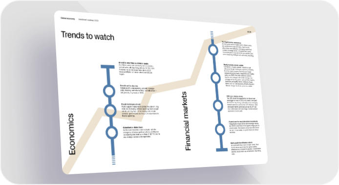 Global economy Investment roadmap 2023 22 | 23 The fixed income renaissance As bond yields reset at higher levels, inflation peaks, Trends to watch and central banks stop rate hikes, fixed income returns look more attractive. Emerging market hard currency sovereign bonds, US government bonds, investment grade corporate bonds and selected yield curve steepening strategies look particularly interesting. Equity markets remain volatile An end to rate hikes as inflation peaks Contraction of equity markets’ valuation is well As inflation peaks and eventually starts to decline, advanced, though challenged corporate profitability central banks will stop hiking rates in Q1/Q2 2023. from the weak economic backdrop and margin However, we do not expect rate cuts in 2023 pressure should still lead to headwinds and volatility because inflation will remain above central bank going into 2023. We prefer defensive sectors, targets. regions and strategies with stable earnings, low leverage and pricing power, such as Swiss equities, healthcare and quality stocks. Defensive Super- trends such as Silver economy, Infrastructure and Climate change should also prove less volatile. Growth set to stay low Global growth is decelerating, and with monetary policy reaching restrictive territory, we believe that it will generally stay weak in 2023. ts USD seen staying strong The USD should be supported by its interest rate e advantage for most of 2023. As a result, we expect the USD to stay strong, particularly versus emerging Fiscal challenges ahead market currencies such as the CNY. However, some Public support measures to combat the cost-of-living developed market currencies such as the JPY are crisis and increasing defense spending mean budget now undervalued and could stage a turnaround and deficits will stay high. As borrowing costs remain appreciate at some point. elevated, governments are likely to increase taxes to finance spending. A good year for most alternative investments Hedge funds should deliver above-average returns, Globalization dialed back and 2023 is also likely to be a good vintage year for As the world becomes more multipolar with the private equity. Secondaries and private debt should emergence of various political spheres of influence, do well. In real estate, we prefer listed over direct we expect global trade as a share of GDP to decline solutions. and strategic sectors to be repatriated. conomics Multi-asset diversification returns As bond yields have reset at higher levels, fixed E Financial mark income as an asset class has gained relative attractiveness compared to equities. Diversification benefits should return as central banks stop hiking rates.