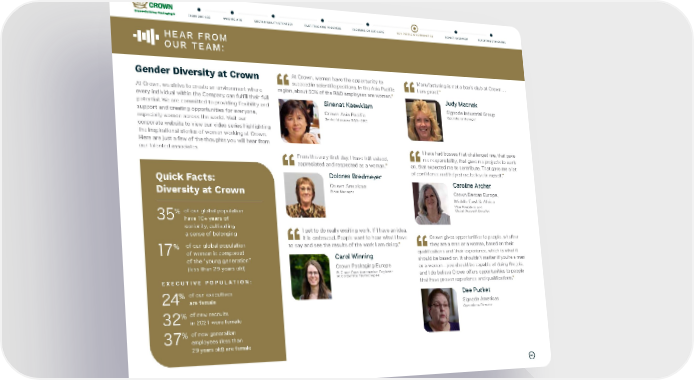 60 HEAR FROM OUR TEAM: Gender Diversity at Crown At Crown, we strive to create an environment where every individual within the Company can fulfill their full potential. We are committed to providing flexibility and support and creating opportunities for everyone, especially women across the world. Visit our corporate website to view our video series highlighting the inspirational stories of women working at Crown. Here are just a few of the thoughts you will hear from our talented associates. Manufacturing is not a boy’s club at Crown ... I am proof. ” Judy Macnak Signode Industrial Group Operations Manager I get to do really exciting work. If I have an idea, it is embraced. People want to hear what I have to say and see the results of the work I am doing. ” Carol Winning Crown Packaging Europe PLC and Data Automation Engineer at Corporate Technologies Crown gives opportunities to people, whether they are a man or a woman, based on their qualifications and their experience, which is what it should be based on. It shouldn’t matter if you’re a man or a woman—you should be capable of doing the job, and I do believe Crown offers opportunities to people that have proven experience and qualifications. ” Dee Pucket Signode Americas Operations Director At Crown, women have the opportunity to succeed in scientific positions. In the Asia Pacific region, about 50% of the R&D employees are women. ” Sinenat Kaewklam Crown Asia Pacific Senior Manager R&D—2PC From the very first day, I have felt valued, appreciated and respected as a woman. ” Dolores Bredmeyer Crown Americas Plant Manager I have had bosses that challenged me, that gave me responsibility, that gave me projects to work on, that expected me to contribute. That gave me a lot of confidence and helped me believe in myself. ” Caroline Archer Crown Bevcan Europe, Middle East & Africa Vice President and Global Account Director Quick Facts: Diversity at Crown EXECUTIVE POPULATION: of new recruits in 2021 were female of new generation employees (less than 29 years old) are female of our executives are female 24 % 32 % 37 % of our global population have 10+ years of seniority, cultivating a sense of belonging 35 % of our global population of women is composed of the “young generation” (less than 29 years old) 17 % FAST-TRACKING PROGRESS FOCUSING ON OUR CORE OUR PEOPLE & COMMUNITIES REPORT OVERVIEW REPORTING STANDARDS SUSTAINABILITY STRATEGY FROM OUR CEO WHO WE ARE