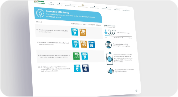 24 GOALS SUSTAINABLE DEVELOPMENT GOALS 06. Reduce water usage in our operations by 20% by the end of 2025. 07. Maintain a 100% track record of meeting local wastewater standards. 08. Ensure all employees have continued access to safe water, sanitation and hygiene (WASH). 09. By 2030, be replenishing 100% of water consumed from high scarcity risk watersheds back to those watersheds. Resource Efficiency Prioritizes the preservation of water as the global supply becomes increasingly scarce. O U R P R O G R E S S (AS OF DECEMBER 31, 2021) Commitment made to our first water replenishment project. Effluent wastewater meters installed on 96% of aluminum beverage can lines globally. We aim to have meters installed on 100% of these lines by the end of 2022. Flowmeters installed on 100% of beverage line washers globally. 2019 Total Goal Progress: 18% 2025 Goal 3.6 % reduction in water usage. FAST-TRACKING PROGRESS FOCUSING ON OUR CORE OUR PEOPLE & COMMUNITIES REPORT OVERVIEW REPORTING STANDARDS SUSTAINABILITY STRATEGY FROM OUR CEO WHO WE ARE