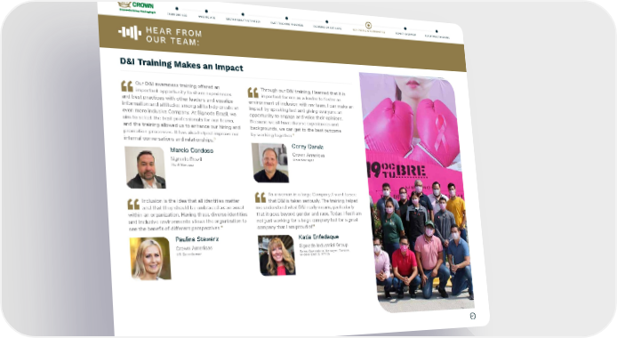 61 HEAR FROM OUR TEAM: D&I Training Makes an Impact Through our D&I training, I learned that it is important for me as a leader to foster an environment of inclusion with my team. I can make an impact by speaking last and giving everyone an opportunity to engage and voice their opinions. Because we all have diverse experiences and backgrounds, we can get to the best outcome by working together. ” Corey Darula Crown Americas Plant Manager As a woman in a large Company, I want to see that D&I is taken seriously. The training helped me understand what D&I really means, particularly that it goes beyond gender and race. Today, I feel I am not just working for a large company but for a great company that I am proud of. ” Katia Enfedaque Signode Industrial Group Sales Operations Manager, Europe, Middle East & Africa Our D&I awareness training offered an important opportunity to share experiences and best practices with other leaders and equalize information and attitudes among all to help create an even more inclusive Company. At Signode Brazil, we aim to select the best professionals for our teams, and the training allowed us to enhance our hiring and promotion processes. It has also helped improve our internal conversations and relationships. ” Marcio Cordoso Signode Brazil Plant Manager Inclusion is the idea that all identities matter and that they should be embraced as an asset within an organization. Having these diverse identities and inclusive environments allows the organization to see the benefit of different perspectives. ” Paulina Stawarz Crown Americas HR Coordinator FAST-TRACKING PROGRESS FOCUSING ON OUR CORE OUR PEOPLE & COMMUNITIES REPORT OVERVIEW REPORTING STANDARDS SUSTAINABILITY STRATEGY FROM OUR CEO WHO WE ARE