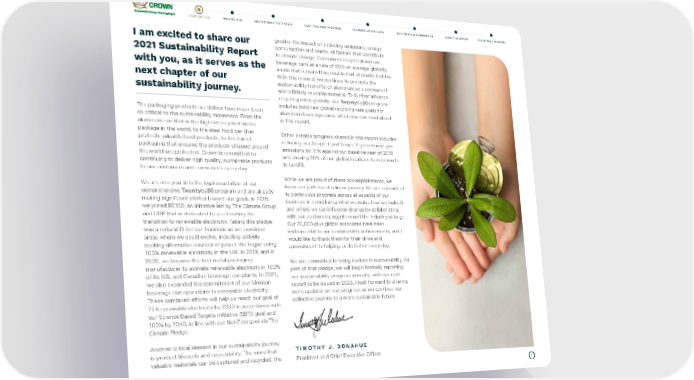 1 The packaging products we deliver have never been so critical to the sustainability movement. From the aluminum can that is the highest-recycled drinks package in the world, to the steel food can that protects valuable food products, to the transit packaging that ensures the products shipped around the world are protected, Crown is committed to continuing to deliver high quality, sustainable products to our customers and consumers every day. We are one year into the implementation of our comprehensive Twenty by 30 program and are already making significant strides toward our goals. In 2019, we joined RE100, an initiative led by The Climate Group and CDP that is dedicated to accelerating the transition to renewable electricity. Taking this pledge was a natural fit for our business as we examined areas where we could evolve, including actively seeking alternative sources of power. We began using 100% renewable electricity in the U.K. in 2019, and in 2020, we became the first metal packaging manufacturer to activate renewable electricity in 100% of its U.S. and Canadian beverage can plants. In 2021, we also expanded the commitment of our Mexican beverage can operations to renewable electricity. These combined efforts will help us reach our goal of 75% renewable electricity by 2030 in accordance with our Science Based Targets initiative (SBTi) goal and 100% by 2040, in line with our Net-Zero goal via The Climate Pledge. Another critical element in our sustainability journey is product lifecycle and recyclability. The more that valuable materials can be captured and recycled, the greater the impact on reducing emissions, energy consumption and waste, all factors that contribute to climate change. Consumers recycle aluminum beverage cans at a rate of 69% on average globally, a rate that is more than double that of plastic bottles. With this in mind, we continue to promote the sustainability benefits of aluminum as a permanent and infinitely reusable material. To further advance recycling rates globally, our Twenty by 30 program includes bold new global recycling rate goals for aluminum beverage cans, which you can read about in this report. Other notable progress shared in this report includes reducing our Scope 1 and Scope 2 greenhouse gas emissions by 11% against our baseline year of 2019 and moving 28% of our global locations to zero waste to landfill. While we are proud of these accomplishments, we know our path is not a linear journey. We are committed to continuous progress across all aspects of our business in considering what we make, how we make it and where we can influence change by collaborating with our customers, suppliers and the industry at large. Our 26,000-plus global associates have been instrumental to our sustainability achievements, and I would like to thank them for their drive and commitment to helping us do better every day. We are committed to being leaders in sustainability. As part of that pledge, we will begin formally reporting our sustainability progress annually, with our next report to be issued in 2023. I look forward to sharing more updates on our progress as we continue our collective journey to a more sustainable future. TIMOTHY J. DONAHUE President and Chief Executive Officer I am excited to share our 2021 Sustainability Report with you, as it serves as the next chapter of our sustainability journey. FAST-TRACKING PROGRESS FOCUSING ON OUR CORE OUR PEOPLE & COMMUNITIES REPORT OVERVIEW REPORTING STANDARDS SUSTAINABILITY STRATEGY FROM OUR CEO WHO WE ARE