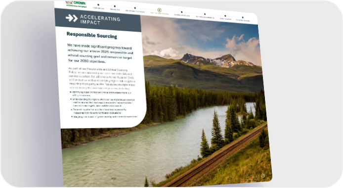 31 ACCELERATING IMPACT Responsible Sourcing We have made significant progress toward achieving our interim 2025 responsible and ethical sourcing goal and remain on target for our 2030 objectives. As part of our Responsible and Ethical Sourcing Policy, we are assessing our core raw materials and service suppliers for adherence to our Supplier Code of Conduct as well as identifying higher-risk suppliers requiring third-party audits. We review multiple areas of risk during the assessment process, including: ⹅ Identifying suppliers that are critical and fundamental to our ability to operate. ⹅ Understanding the regions where our raw materials are sourced and the impact that local regulations and/or law enforcement have on human rights, labor and the environment. ⹅ Determining whether suppliers have been assessed by independent third-party verification evaluations. ⹅ Weighing the impact of governance by multinational corporations. 31 FAST-TRACKING PROGRESS FOCUSING ON OUR CORE OUR PEOPLE & COMMUNITIES REPORT OVERVIEW REPORTING STANDARDS SUSTAINABILITY STRATEGY FROM OUR CEO WHO WE ARE