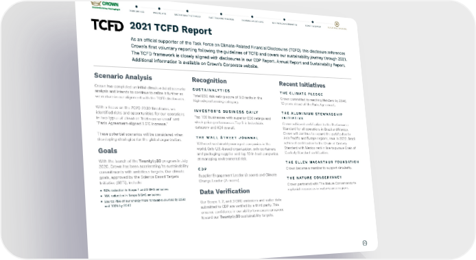 79 Scenario Analysis Crown has completed an initial climate-related scenario analysis and intends to continue to refine it further as we mature in our alignment with the TCFD disclosures. With a focus on the 2020–2030 timeframe, we identified risks and opportunities for our operations in two types of climates: “business as usual” and “Paris Agreement-aligned 1.5°C increase.” These potential scenarios will be considered when developing strategies for the global organization. Goals With the launch of the Twenty by 30 program in July 2020, Crown has been accelerating its sustainability commitments with ambitious targets. Our climate goals, approved by the Science Based Targets Initiative (SBTi), include: ⹅ 50% reduction in Scope 1 and 2 GHG emissions ⹅ 16% reduction in Scope 3 GHG emissions ⹅ Source 75% of our energy from renewable sources by 2030 and 100% by 2040 Recognition SUSTAINALYTICS Total ESG risk rating score of 9.8 ranks in the highest-performing category. INVESTOR’S BUSINESS DAILY Top 100 businesses with superior ESG ratings and stock price performance: Top 5 in Industrials category and #24 overall. THE WALL STREET JOURNAL 100 most sustainably managed companies in the world: Only U.S.-based organization, only containers and packaging supplier and top 10 in best companies at managing environmental risk. CDP Supplier Engagement Leader (A score) and Climate Change Leader (A- score). Data Verification Our Scope 1, 2, and 3 GHG emissions and water data submitted to CDP are verified by a third party. This ensures confidence in our ability to measure progress toward our Twenty by 30 sustainability targets. Recent Initiatives THE CLIMATE PLEDGE Crown committed to reaching Net-Zero by 2040, 10 years ahead of the Paris Agreement. THE ALUMINIUM STEWARDSHIP INITIATIVE Crown achieved certification to the Performance Standard for all operations in Brazil and Mexico. Crown will continue to expand the certification to Asia Pacific and Europe regions, next. In 2022, Brazil achieved certification to the Chain of Custody Standard with Mexico next in line to pursue Chain of Custody Standard certification. THE ELLEN MACARTHUR FOUNDATION Crown became a member to support circularity. THE NATURE CONSERVANCY Crown partnered with The Nature Conservancy to replenish resources in water-scarce regions. 2021 TCFD Report As an official supporter of the Task Force on Climate-Related Financial Disclosures (TCFD), this disclosure references Crown’s first voluntary reporting following the guidelines of TCFD and covers our sustainability journey through 2021. The TCFD framework is closely aligned with disclosures in our CDP Report, Annual Report and Sustainability Report. Additional information is available on Crown’s Corporate website. FAST-TRACKING PROGRESS FOCUSING ON OUR CORE OUR PEOPLE & COMMUNITIES REPORT OVERVIEW REPORTING STANDARDS SUSTAINABILITY STRATEGY FROM OUR CEO WHO WE ARE FAST-TRACKING PROGRESS FOCUSING ON OUR CORE OUR PEOPLE & COMMUNITIES REPORT OVERVIEW REPORTING STANDARDS SUSTAINABILITY STRATEGY FROM OUR CEO WHO WE ARE FAST-TRACKING PROGRESS FOCUSING ON OUR CORE OUR PEOPLE & COMMUNITIES REPORT OVERVIEW REPORTING STANDARDS SUSTAINABILITY STRATEGY FROM OUR CEO WHO WE ARE