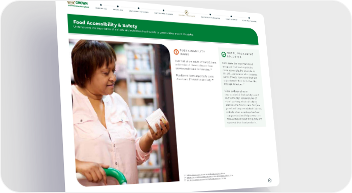 52 25 https://www.cancentral.com/foodcans/nutritious 26 https://www.cdc.gov/foodsafety/cdc-and-food-safety.html 27 https://www.cancentral.com/foodcans/nutritious Food Accessibility & Safety Underscoring the importance of a stable and nutritious food supply to communities around the globe. SUSTAINABILITY ISSUE METAL PACKAGING SOLUTION Over half of the adults in the U.S. have a diet-related chronic disease from growing nutritional deficiencies. 25 Foodborne illness reportedly costs Americans $15.6 billion annually. 26 Cans make the important food groups of fruit and vegetables more accessible. For example, in the U.S., consumers who consume canned foods have more fruit and vegetables in their diets than the average American. 27 Metal packaging has an unprecedented food safety record due to the high temperatures of retort cooking, which effectively sterilizes the food in cans. Tamper- proof and tamper-resistant features indicate when a package has been compromised and help consumers feel confident about the quality and safety of their food products. FAST-TRACKING PROGRESS FOCUSING ON OUR CORE OUR PEOPLE & COMMUNITIES REPORT OVERVIEW REPORTING STANDARDS SUSTAINABILITY STRATEGY FROM OUR CEO WHO WE ARE