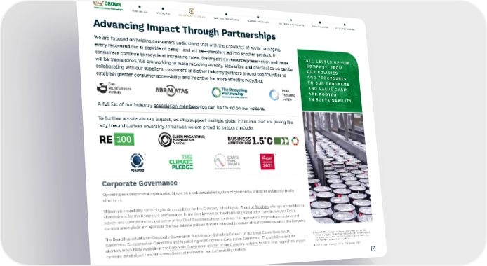 18 Advancing Impact Through Partnerships We are focused on helping consumers understand that with the circularity of metal packaging, every recovered can is capable of being—and will be—transformed into another product. If consumers continue to recycle at increasing rates, the impact on resource preservation and reuse will be tremendous. We are working to make recycling as easy, accessible and practical as we can by collaborating with our suppliers, customers and other industry partners around opportunities to establish greater consumer accessibility and incentive for more effective recycling. A full list of our industry association memberships can be found on our website. To further accelerate our impact, we also support multiple global initiatives that are paving the way toward carbon neutrality. Initiatives we are proud to support include: 3 4 Corporate Governance Operating as a responsible organization hinges on a well-established system of governance principles and accountability structures. Ultimate responsibility for setting business policies for the Company is held by our Board of Directors , who are accountable to shareholders for the Company’s performance. In the best interest of the shareholders and other constituents, the Board selects and controls the compensation of the Chief Executive Officer, confirms that appropriate corporate procedures and controls are in place and approves the foundational policies that are intended to ensure ethical operations within the Company. The Board has established Corporate Governance Guidelines and charters for each of our three Committees (Audit Committee, Compensation Committee and Nominating and Corporate Governance Committee). The guidelines and the charters are publicly available in the Corporate Governance section of our Company website . See the next page of this report for more detail about how our Committees get involved in our sustainability strategy. ALL LEVELS OF OUR COMPANY, FROM OUR POLICIES AND PROCEDURES TO OUR PROGRAMS AND VALUE CHAIN, ARE ROOTED IN SUSTAINABILITY. 3 Since 2022, Crown has been committed to the UN Global Compact corporate responsibility initiative and its principles in the areas of human rights, labor, the environment and anti-corruption. 4 CDP Climate Change 2022, CDP Water 2022. FAST-TRACKING PROGRESS FOCUSING ON OUR CORE OUR PEOPLE & COMMUNITIES REPORT OVERVIEW REPORTING STANDARDS SUSTAINABILITY STRATEGY FROM OUR CEO WHO WE ARE