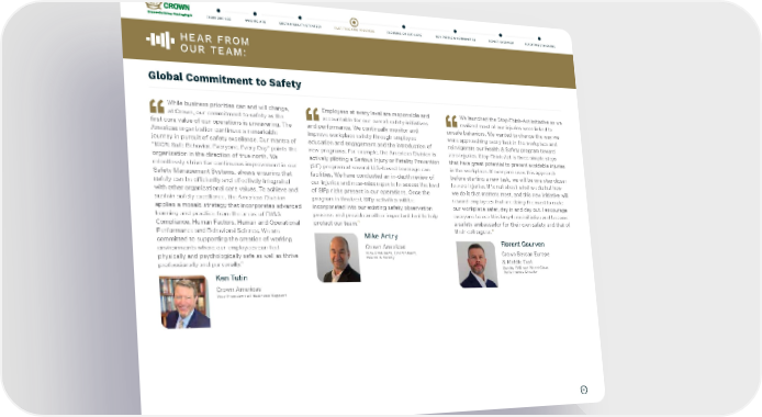 37 HEAR FROM OUR TEAM: Global Commitment to Safety Employees at every level are responsible and accountable for our overall safety initiatives and performance. We continually monitor and improve workplace safety through employee education and engagement and the introduction of new programs. For example, the Americas Division is actively piloting a Serious Injury or Fatality Prevention (SIF) program at several U.S.-based beverage can facilities. We have conducted an in-depth review of our injuries and near-miss reports to assess the level of SIFp risks present in our operations. Once the program is finalized, SIFp activities will be incorporated into our existing safety observation process and provide another important tool to help protect our team. ” Mike Antry Crown Americas Vice President, Environment, Health & Safety We launched the Stop-Think-Act initiative as we realized most of our injuries were linked to unsafe behaviors. We wanted to change the way we were approaching every task in the workplace and reinvigorate our Health & Safety program toward zero injuries. Stop-Think-Act is three simple steps that have great potential to prevent avoidable injuries in the workplace. If everyone uses this approach before starting a new task, we will be one step closer to zero injuries. It is not about what we do but how we do it that matters most, and this new initiative will reward employees that are doing the most to make our workplace safer, day in and day out. I encourage everyone to use this long-term initiative and become a safety ambassador for their own safety and that of their colleagues. ” Florent Gourven Crown Bevcan Europe & Middle East Quality EHS and World-Class Performance Director While business priorities can and will change, at Crown, our commitment to safety as the first core value of our operations is unwavering. The Americas organization continues a remarkable journey in pursuit of safety excellence. Our mantra of “100% Safe Behavior, Everyone, Every Day” points the organization in the direction of true north. We relentlessly strive for continuous improvement in our Safety Management Systems, always ensuring that safety can be efficiently and effectively integrated with other organizational core values. To achieve and sustain safety excellence, the Americas Division applies a mosaic strategy that incorporates advanced learning and practice from the areas of EH&S Compliance, Human Factors, Human and Operational Performance and Behavioral Science. We are committed to supporting the creation of working environments where our employees can feel physically and psychologically safe as well as thrive professionally and personally. ” Ken Tutin Crown Americas Vice President of Business Support FAST-TRACKING PROGRESS FOCUSING ON OUR CORE OUR PEOPLE & COMMUNITIES REPORT OVERVIEW REPORTING STANDARDS SUSTAINABILITY STRATEGY FROM OUR CEO WHO WE ARE