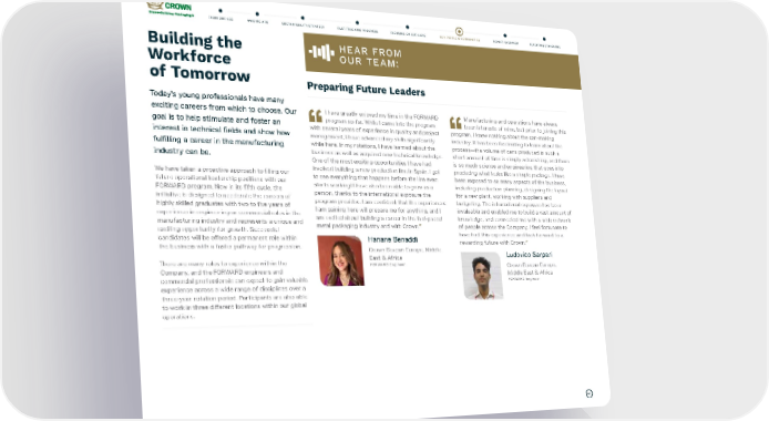 63 HEAR FROM OUR TEAM: Preparing Future Leaders Building the Workforce of Tomorrow Today’s young professionals have many exciting careers from which to choose. Our goal is to help stimulate and foster an interest in technical fields and show how fulfilling a career in the manufacturing industry can be. We have taken a proactive approach to filling our future operational leadership positions with our FORWARD program. Now in its fifth cycle, the initiative is designed to accelerate the careers of highly skilled graduates with two to five years of experience in engineering or commercial roles in the manufacturing industry and represents a unique and exciting opportunity for growth. Successful candidates will be offered a permanent role within the business with a faster pathway for progression. There are many roles to experience within the Company, and the FORWARD engineers and commercial professionals can expect to gain valuable experience across a wide range of disciplines over a three-year rotation period. Participants are also able to work in three different locations within our global operations. I have greatly enjoyed my time in the FORWARD program so far. While I came into the program with several years of experience in quality and project management, I have advanced my skills significantly while here. In my rotations, I have learned about the business as well as acquired new technical knowledge. One of the most exciting opportunities I have had involved building a new production line in Spain. I got to see everything that happens before the line even starts working! I have also been able to grow as a person, thanks to the international exposure the program provides. I am confident that the experiences I am gaining here will prepare me for anything, and I am excited about building a career in the fast-paced metal packaging industry and with Crown. ” Hanane Benaddi Crown Bevcan Europe, Middle East & Africa FORWARD Engineer Manufacturing and operations have always been interests of mine, but prior to joining this program, I knew nothing about the can-making industry. It has been fascinating to learn about the process—the volume of cans produced in such a short amount of time is simply astonishing, and there is so much science and engineering that goes into producing what looks like a simple package. I have been exposed to so many aspects of the business, including production planning, designing the layout for a new plant, working with suppliers and budgeting. The international exposure has been invaluable and enabled me to build a vast amount of knowledge, and connected me with a wide network of people across the Company. I feel fortunate to have had this experience and look forward to a rewarding future with Crown. ” Ludovico Sarperi Crown Bevcan Europe, Middle East & Africa FORWARD Engineer FAST-TRACKING PROGRESS FOCUSING ON OUR CORE OUR PEOPLE & COMMUNITIES REPORT OVERVIEW REPORTING STANDARDS SUSTAINABILITY STRATEGY FROM OUR CEO WHO WE ARE