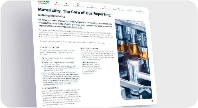 15 Materiality: The Core of Our Reporting Defining Materiality We strive to conduct a formal Sustainability Materiality Assessment in accordance with the Global Reporting Initiative’s (GRI) guidelines every two years. Our latest assessment began in 2021 and was completed in March 2022. Performing a formal Sustainability Materiality Assessment helps identify a set of sustainability-related focus areas that our stakeholders care about and that intersect with our business. These focus areas are identified with the input of over 100 internal and external stakeholders. See pages 16–17 for a summary of priority topics from our latest assessment. Our process when performing a Sustainability Materiality Assessment includes three main steps: 1. IDENTIFICATION We update and hone our assessments each time to reflect the key changes since our last report, including: ⹅ Significant changes in our business, such as acquisitions and divestitures. ▢ Alignment with GRI Standards, reporting via the latest reporting guidance offered. ▢ Other changes related to our business, customers, public policy, the context in which we do business and the evolving expectations of key stakeholders. ⹅ While sustainability is an evolving field, topics and lessons learned from our initial materiality assessment remain relevant today. During each assessment, we conduct in-depth interviews with customers, industry associations, employees and Company executives from around the world, in addition to reviewing the sustainability priorities of our customers and peer companies and researching key topics affecting the industry. 2. EVALUATION Our evaluation process includes speaking directly with identified key stakeholders via an independent third party, assessing reports outlining the environmental, social and governance stakeholders for the industry and analyzing our business plans, strategies and key risk assessments. Industry peers and enterprise customers are also benchmarked as part of this analysis. 3. PRIORITIZATION While all the topics identified as part of this process are important, six of the most “material” issues were ranked as among the most critical to manage on a continuing basis and have served as the foundation for our Twenty by 30 program : ⹅ Energy & Carbon Footprint ⹅ Water Management & Scarcity ⹅ Waste Reduction & Management ⹅ Employee Health, Safety & Wellness ⹅ Product Quality & Safety ⹅ Business Ethics FAST-TRACKING PROGRESS FOCUSING ON OUR CORE OUR PEOPLE & COMMUNITIES REPORT OVERVIEW REPORTING STANDARDS SUSTAINABILITY STRATEGY FROM OUR CEO WHO WE ARE