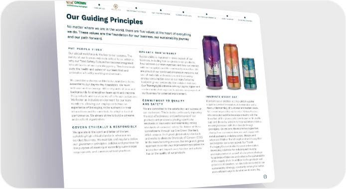 6 Our Guiding Principles No matter where we are in the world, there are five values at the heart of everything we do. These values are the foundation for our business, our sustainability journey and our path forward. PUT PEOPLE FIRST Our global workforce is the key to our success. The safety of our team members is critical to us, which is why our Total Safety Culture has become integrated into all facets of our operating policy. This framework puts the health and safety of our team first and promotes a healthy working environment. We consider a diverse and inclusive workforce to be essential to our day-to-day operations. We must welcome and encourage different points of view and backgrounds to strengthen team spirit and improve the products and services we offer to our customers. We foster an inclusive environment for our team members, allowing our employees to have an experience of belonging, to be authentic in their interactions and to contribute to a higher level of performance. We always strive to build a cohesive and resilient organization. GOVERN ETHICALLY & RESPONSIBLY We operate in the spirit and letter of the law, upholding high ethical standards wherever we conduct business. We maintain and regularly review our governance principles, policies and practices for the purpose of meeting or exceeding current legal requirements and commercial best practices. OPERATE SUSTAINABLY Sustainability is ingrained in every aspect of our business, including how we produce our products, how we treat our team members and how we interact with our suppliers and the community around us. We are proud of our continued progress in reducing our use of materials and resources and decreasing energy consumption even as our manufacturing footprint grows and production volumes increase. Our Twenty by 30 initiative sets our sights higher and continuously challenges us to assess every aspect of our business for potential improvement. COMMITMENT TO QUALITY AND SAFETY We are committed to the satisfaction and success of our customers. This includes continuously improving the cost-effectiveness and performance of our products and processes, placing a particular emphasis on innovation and maintaining strong standards of consumer safety. We deliver on these commitments through our One Crown Standard, which ensures the highest global safety standards and works to eliminate Chemicals of Concern (COC) in the manufacturing process. Our integrated, global approach to continuous improvement recognizes the interaction and impact every function and activity has on the quality of our products. INNOVATE EVERY DAY Maintaining our position as a top global supplier requires constant innovation, determination and a deep understanding of customer and market needs. We remain inspired by our founder, William Painter, who revolutionized the beverage industry with the invention of the crown cork (now known as the bottle cap) and driven by a desire to help customers make a meaningful impact with their brands through packaging. We strive to develop technologies that change how consumers view, use and engage with metal packaging, including colors, designs and advanced finishes that strengthen brand recognition and heighten consumer appeal. Our Transit Packaging Division is also focused on innovation, developing solutions for reducing and reusing packaging materials as part of a long-term strategy to optimize efficiencies and enhance the sustainability of the supply chain. In addition to the products and processes themselves, we aim to be innovative in our sustainability strategy, constantly striving for better, more efficient ways to do what we do every day. FAST-TRACKING PROGRESS FOCUSING ON OUR CORE OUR PEOPLE & COMMUNITIES REPORT OVERVIEW REPORTING STANDARDS SUSTAINABILITY STRATEGY FROM OUR CEO WHO WE ARE