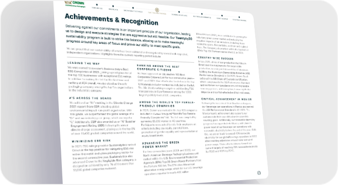35 Achievements & Recognition Delivering against our commitments is an important principle of our organization, leading us to design and execute strategies that are aggressive but still feasible. Our Twenty by 30 sustainability program is built to strike this balance, allowing us to make meaningful progress around key areas of focus and prove our ability to meet specific goals. We are proud that our sustainability efforts have been validated and recognized by several well-respected, independent organizations. Highlights from the current reporting period include: LEADING THE WAY We were named to Investor’s Business Daily’s Best ESG Companies of 2021, joining a prestigious list of the top 100 businesses with exceptional ESG ratings. In addition to making the list for the first time and ranking at #24 overall, we also stood as the only packaging company among the top five organizations in the Industrials category. A’S ACROSS THE BOARD We achieved an “A-” ranking in the Climate Change 2021 report from CDP, a leading global environmental impact non-profit organization. With this grade, we outperformed the global average of a “B-” and our industry peer group, which averaged a “C.” Additionally, CDP also awarded us an “A” Supplier Engagement Rating (SER) following its annual climate change assessment, placing us in the top 8% of over 11,400 graded companies around the world. MINIMIZING ESG RISK In 2021, ESG ratings provider Sustainalytics ranked Crown in the top position for mitigating ESG risk within the metal and glass packaging sector for the second consecutive year. Sustainalytics also advanced Crown to the Negligible Risk category, a designation achieved by only 1% of the more than 12,000 global companies reviewed. RANKING AMONG THE BEST CORPORATE CITIZENS We have appeared on 3BL Media’s 100 Best Corporate Citizens List for two consecutive years— 2021 and 2022. Our efforts also landed us in the top 10 Materials industry companies included on the list. The 3BL Media ranking recognizes outstanding ESG transparency and performance among the 1,000 largest publicly-traded U.S. companies. AMONG THE WORLD’S TOP FEMALE- FRIENDLY COMPANIES In 2021, Crown was ranked in the top 100 companies included in Forbes’ inaugural “World’s Top Female- Friendly Companies” list. The list was compiled by surveying 85,000 women in 40 countries. Participants were asked to rate their employers on criteria including pay equity, parental leave, promotion of gender equality and representation at equity board levels. ADVANCING THE GREEN POWER MARKET For two consecutive years (2021 and 2022), our North American Beverage Packaging business unit ranked within the U.S. Environmental Protection Agency’s (EPA) Top 25 Green Power Partners from the Fortune 500 list. The EPA cites this annual alternative energy usage, which for our U.S. beverage operations equates to nearly 400 million kilowatt-hours (kWh), as a contributor to growing the voluntary green power market and reducing the negative impacts of air emissions, including those related to ozone, fine particles, acid rain and regional haze. The Company also ranked within the top half of EPA’s Top 100 Partners across the U.S. in 2022. COUNTRY-WIDE SUCCESS In late 2021, all six of our production facilities in Brazil met the requirements for responsible production, sourcing and stewardship of aluminum, fulfilling the Aluminium Stewardship Initiative (ASI) Performance Standard. In Q1 2022, Crown Brazil achieved the ASI Chain of Custody certification, which complements the ASI Performance Standard and reinforces our compliance around responsible sourcing policies, anti-corruption, human rights due diligence and conflict-affected and high-risk areas. CRITICAL ADVANCEMENT IN MEXICO Following the success of their Brazilian colleagues, our beverage can operations in Mexico also earned the ASI Performance Standard in Q1 2022. The Mexico team’s achievement also supports our customers in their own ethical and responsible sourcing goals. Additionally, our renewable electricity progress has expanded into Mexico, with plans to power most of our beverage can operations with renewable electricity before the end of the year. With this, we are on track to exceed 40% renewable electricity for our global beverage operations in 2022 after reaching milestones around solar and wind power usage. These efforts drive us toward our current targets of reaching 75% renewable electricity by 2030 and 100% by 2040. FAST-TRACKING PROGRESS FOCUSING ON OUR CORE OUR PEOPLE & COMMUNITIES REPORT OVERVIEW REPORTING STANDARDS SUSTAINABILITY STRATEGY FROM OUR CEO WHO WE ARE