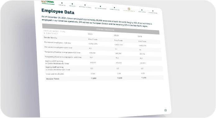 56 Employee Data As of December 31, 2021, Crown employed approximately 26,000 associates around the world. Roughly 46% of our workforce is employed in our Americas operations, 24% across our European Division and the remaining 30% in the Asia Pacific region. CROWN AMERICAS EMPLOYMENT TYPE & CONTRACT 2021 2020 2019 Gender Identity Male/Female Male/Female Male/Female Permanent employees—full time 8,874/1,875 8,437/1,721 8,637/1,776 Permanent employees—part time 6/3 7/3 7/4 Temporary/fixed-term employees—full time 405/168 392/152 362/119 Temporary/fixed-term employees—part time 19/1 15/3 16/3 Agency staff working in Crown facilities—full time 426/115 451/125 381/101 Agency staff working in Crown facilities—part time 0/0 0/0 0/0 Unionized employees 5,846 5,298 5,252 Division Totals 11,892 11,306 11,406 FAST-TRACKING PROGRESS FOCUSING ON OUR CORE OUR PEOPLE & COMMUNITIES REPORT OVERVIEW REPORTING STANDARDS SUSTAINABILITY STRATEGY FROM OUR CEO WHO WE ARE