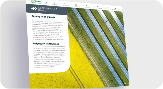 23 ACCELERATING IMPACT Zeroing in on Climate Our actions to decrease our emissions and improve our electricity consumption ladder up to our larger commitment to be carbon neutral by 2040. This work aligns with our commitments to global industry movements, including The Climate Pledge and RE100—groups calling for all industrial sectors to do their part to slow the pace of climate change. The path to Net-Zero continues to factor into our business decisions as we find ways to deliver high- quality products to customers in increasing volumes while remaining careful stewards of the environment. Relying on Renewables We are moving toward greater reliance on renewables by increasing our use of wind and solar power across our operations. We are well on our way to achieving our goal of 100% renewable electricity by 2040. In 2019, we began using 100% renewable electricity in the U.K. In 2020, we became the first metal packaging manufacturer to activate renewable electricity in 100% of its U.S. and Canadian beverage can plants. In 2021, we also took steps to increase the amount of renewable energy our Mexican beverage can operations utilized. FAST-TRACKING PROGRESS FOCUSING ON OUR CORE OUR PEOPLE & COMMUNITIES REPORT OVERVIEW REPORTING STANDARDS SUSTAINABILITY STRATEGY FROM OUR CEO WHO WE ARE