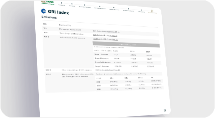 74 Emissions 305 Emissions 2016 103 Management Approach 2016 2021 Sustainability Report Page 39–40 305-1 Direct (Scope 1) GHG emissions 2021 Sustainability Report Page 40 305-2 Indirect (Scope 2) GHG emissions 2021 Sustainability Report Page 40 ADDITIONAL DATA All GHG emissions are measured in Metric Tons (MT)of CO 2 e LOCATION-BASED 2019 2020 2021 Scope 1 Emissions 511,857 490,013 545,488 Scope 2 Emissions 789,180 764,625 800,352 Scope 1+2 Emissions 1,301,037 1,254,638 1,345,840 Scope 3 Emissions 8,938,555 8,962,842 10,230,048 305-3 Other indirect (Scope 3) GHG emissions 2021 Sustainability Report Page 40 305-7 Nitrogen oxides (NO X ), sulfur oxides (SO X ), and other significant air emissions Significant air emissions, in kilograms or multiples, for each of the following: YEAR NO x SO x VOCs PM 2019 846,369kg 72,517kg 59,123kg 52,570 (*PM-10) 2020 645,818kg 31,493kg 43,157kg 40,438 (*PM-10) 2021 824,541kg 93,906kg 56,489kg 52,310 (*PM-10) GRI Index FAST-TRACKING PROGRESS FOCUSING ON OUR CORE OUR PEOPLE & COMMUNITIES REPORT OVERVIEW REPORTING STANDARDS SUSTAINABILITY STRATEGY FROM OUR CEO WHO WE ARE FAST-TRACKING PROGRESS FOCUSING ON OUR CORE OUR PEOPLE & COMMUNITIES REPORT OVERVIEW REPORTING STANDARDS SUSTAINABILITY STRATEGY FROM OUR CEO WHO WE ARE FAST-TRACKING PROGRESS FOCUSING ON OUR CORE OUR PEOPLE & COMMUNITIES REPORT OVERVIEW REPORTING STANDARDS SUSTAINABILITY STRATEGY FROM OUR CEO WHO WE ARE