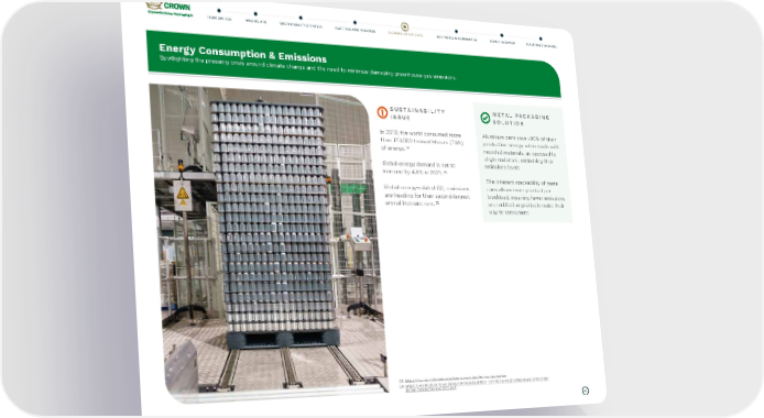 53 Energy Consumption & Emissions Spotlighting the pressing crisis around climate change and the need to minimize damaging greenhouse gas emissions. SUSTAINABILITY ISSUE METAL PACKAGING SOLUTION In 2019, the world consumed more than 173,000 terawatt-hours (TWh) of energy. 28 Global energy demand is set to increase by 4.6% in 2021. 29 Global energy-related CO 2 emissions are heading for their second-largest annual increase ever. 29 Aluminum cans save >90% of their production energy when made with recycled materials, as opposed to virgin materials, minimizing their emissions levels. The inherent stackability of metal cans allows more product per truckload, meaning fewer emissions are emitted as products make their way to consumers. 28 https://ourworldindata.org/energy-production-consumption 29 https://iea.blob.core.windows.net/assets/d0031107-401d-4a2f-a48b-9eed19457335/ GlobalEnergyReview2021.pdf FAST-TRACKING PROGRESS FOCUSING ON OUR CORE OUR PEOPLE & COMMUNITIES REPORT OVERVIEW REPORTING STANDARDS SUSTAINABILITY STRATEGY FROM OUR CEO WHO WE ARE