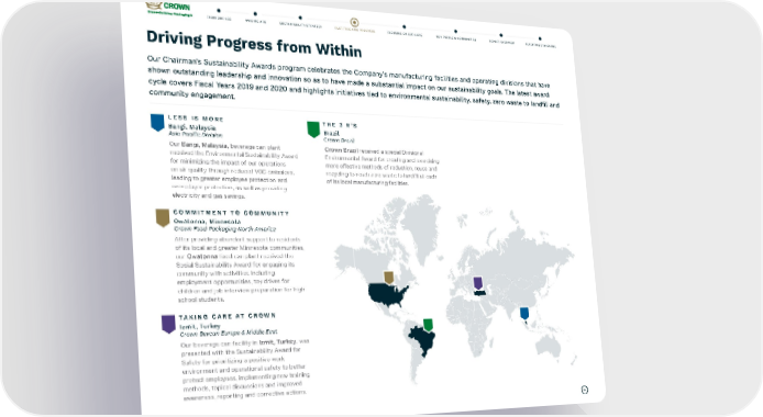 34 LESS IS MORE Bangi, Malaysia Asia Pacific Division Our Bangi, Malaysia, beverage can plant received the Environmental Sustainability Award for minimizing the impact of our operations on air quality through reduced VOC emissions, leading to greater employee protection and ozone layer protection, as well as providing electricity and gas savings. COMMITMENT TO COMMUNITY Owatonna, Minnesota Crown Food Packaging North America After providing abundant support to residents of its local and greater Minnesota communities, our Owatonna food can plant received the Social Sustainability Award for engaging its community with activities, including employment opportunities, toy drives for children and job interview preparation for high school students. TAKING CARE AT CROWN Izmit, Turkey Crown Bevcan Europe & Middle East Our beverage can facility in Izmit, Turkey , was presented with the Sustainability Award for Safety for prioritizing a positive work environment and operational safety to better protect employees, implementing new training methods, topical discussions and improved awareness, reporting and corrective actions. THE 3 R’S Brazil Crown Brazil Crown Brazil received a special Divisional Environmental Award for creating and exercising more effective methods of reduction, reuse and recycling to reach zero waste to landfill at each of its local manufacturing facilities. Driving Progress from Within Our Chairman’s Sustainability Awards program celebrates the Company’s manufacturing facilities and operating divisions that have shown outstanding leadership and innovation so as to have made a substantial impact on our sustainability goals. The latest award cycle covers Fiscal Years 2019 and 2020 and highlights initiatives tied to environmental sustainability, safety, zero waste to landfill and community engagement. FAST-TRACKING PROGRESS FOCUSING ON OUR CORE OUR PEOPLE & COMMUNITIES REPORT OVERVIEW REPORTING STANDARDS SUSTAINABILITY STRATEGY FROM OUR CEO WHO WE ARE