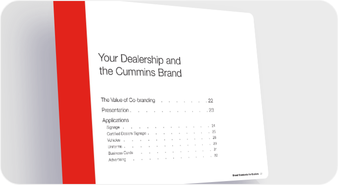 Your Dealership and the Cummins Brand The Value of Co-branding . . . . . . . 22 Presentation . . . . . . . . . . . 23 Applications Signage . . . . . . . . . . . . 24 Certified Dealers Signage . . . . . . . . . 25 Vehicles . . . . . . . . . . . . 28 Uniforms . . . . . . . . . . . . 29 Business Cards . . . . . . . . . . 31 Advertising . . . . . . . . . . . 32 Brand Standards for Dealers 21