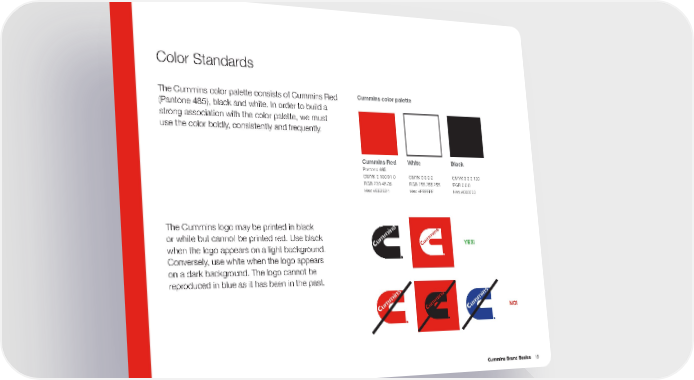 Color Standards The Cummins color palette consists of Cummins Red Cummins color palette (Pantone 485), black and white . In order to build a strong association with the color palette, we must use the color boldly, consistently and frequently . Cummins Red White Black Pantone 485 CMYK 0 100 91 0 CMYK 0 0 0 0 CMYK 0 0 0 100 RGB 238 46 36 RGB 255 255 255 RGB 0 0 0 Hex #EE2E24 Hex #FFFFFF Hex #000000 The Cummins logo may be printed in black or white but cannot be printed red . Use black YES! when the logo appears on a light background . Conversely, use white when the logo appears on a dark background . The logo cannot be reproduced in blue as it has been in the past . NO! Cummins Brand Basics 16