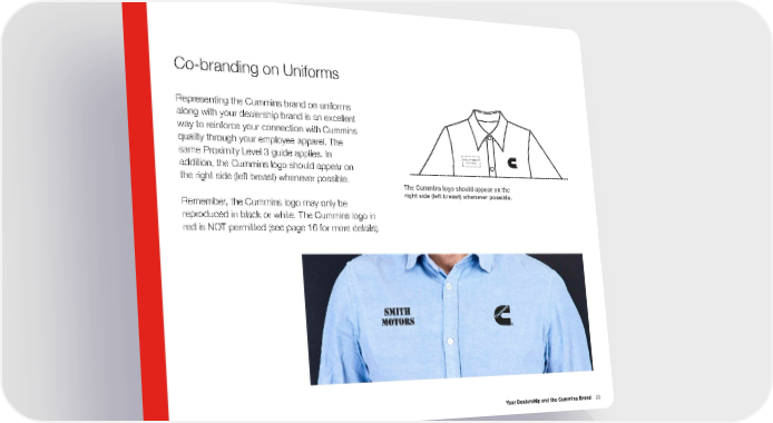 Co-branding on Uniforms Representing the Cummins brand on uniforms along with your dealership brand is an excellent way to reinforce your connection with Cummins quality through your employee apparel . The same Proximity Level 3 guide applies . In DEALER NAME OR LOGO addition, the Cummins logo should appear on the right side (left breast) whenever possible . The Cummins logo should appear on the right side (left breast) whenever possible. Remember, the Cummins logo may only be reproduced in black or white . The Cummins logo in red is NOT permitted (see page 16 for more details) . Your Dealership and the Cummins Brand 29