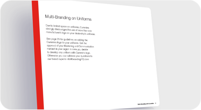 Multi-Branding on Uniforms Due to limited space on uniforms, Cummins strongly discourages the use of more than one manufacturer’s logo on your dealership’s uniforms . See page 29 for guidelines on adding the Cummins logo to your uniforms . Get the approval of your Marketing and Communication contact in your region in case you decide to develop any uniform with Cummins logo . Otherwise you can address your questions to our brand experts info@brandingHQ .com Multi-Branding with Cummins 38