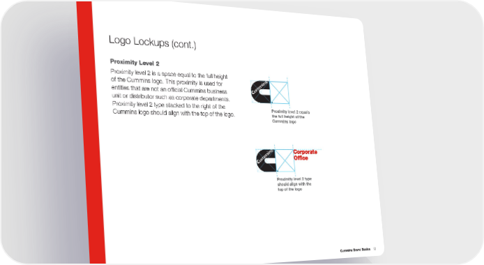 Logo Lockups (cont .) Proximity Level 2 Proximity level 2 is a space equal to the full height of the Cummins logo . This proximity is used for entities that are not an official Cummins business unit or distributor such as corporate departments . Proximity level 2 type stacked to the right of the Proximity level 2 equals Cummins logo should align with the top of the logo . the full height of the Cummins logo Proximity level 2 type should align with the top of the logo Cummins Brand Basics 12