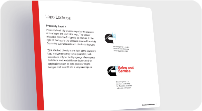 Logo Lockups Proximity Level 1 Proximity level 1 is a space equal to the distance of one leg of the Cummins logo. The closest allowable distance for type to be stacked to the right of the logo is the distance reserved for official Cummins business units and distributor lockups. PPrroximity level 1 equals oximity level 1 equals the distance of one leg the distance of one leg Type stacked directly to the right of the Cummins of the Cummins logoof the Cummins logo logo in close proximity is not permitted, with exceptions only for facility signage where space limitations and readability are factors and for applications such as data plates or engine badges that must fit into a very small space. Proximity level 1 is reserved exclusively for Cummins business units and distributors Cummins Brand Basics 11