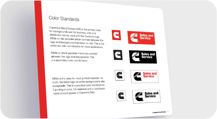 Color Standards Cummins Red (Pantone 485) is the primary color for backgrounds and for business units and distributor names used with the Cummins logo. White on red provides better contrast between the logo and background than black on red. This is the preferred color combination for most applications. White on black provides maximum contrast between the logo and background. This is a secondary color combination. White is the base for most printed materials. As such, the black logo on white background is also acceptable. This is a practical color combination. If printing in color, the business unit or distributor name should appear in Cummins Red. Cummins Brand Basics 17