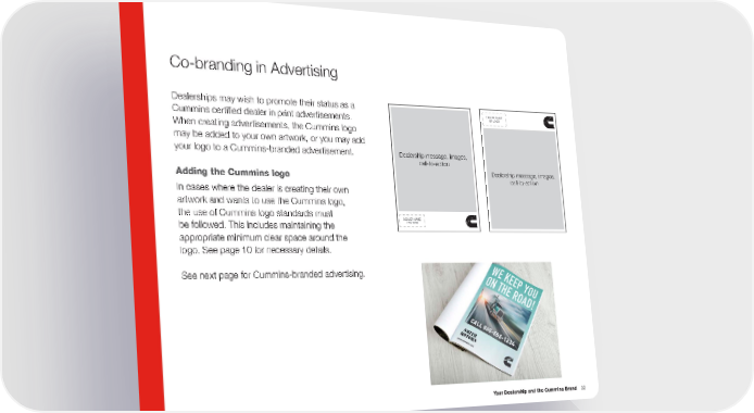 Co-branding in Advertising Dealerships may wish to promote their status as a DEALER NAME Cummins certified dealer in print advertisements . OR LOGO When creating advertisements, the Cummins logo may be added to your own artwork, or you may add your logo to a Cummins-branded advertisement . Dealership message, images, call-to-action Adding the Cummins logo Dealership message, images, call-to-action In cases where the dealer is creating their own artwork and wants to use the Cummins logo, the use of Cummins logo standards must DEALER NAME be followed . This includes maintaining the OR LOGO appropriate minimum clear space around the logo . See page 10 for necessary details . See next page for Cummins-branded advertising . Your Dealership and the Cummins Brand 32