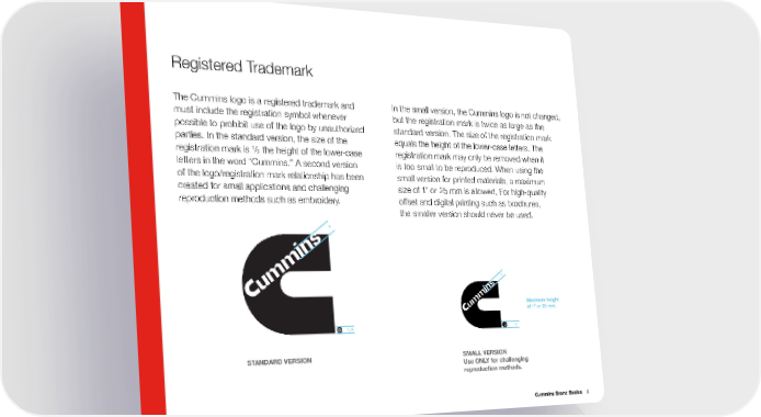 Registered Trademark The Cummins logo is a registered trademark and In the small version, the Cummins logo is not changed, must include the registration symbol whenever but the registration mark is twice as large as the possible to prohibit use of the logo by unauthorized standard version . The size of the registration mark parties . In the standard version, the size of the equals the height of the lower-case letters . The 1 registration mark is / the height of the lower-case registration mark may only be removed when it 2 letters in the word “Cummins .” A second version is too small to be reproduced . When using the of the logo/registration mark relationship has been small version for printed materials, a maximum created for small applications and challenging size of 1" or 25 mm is allowed . For high-quality reproduction methods such as embroidery . offset and digital printing such as brochures, the smaller version should never be used . X Y Maximum height of 1" or 25 mm. 1 / X Y 2 STANDARD VERSION SMALL VERSION Use ONLY for challenging reproduction methods. Cummins Brand Basics 9