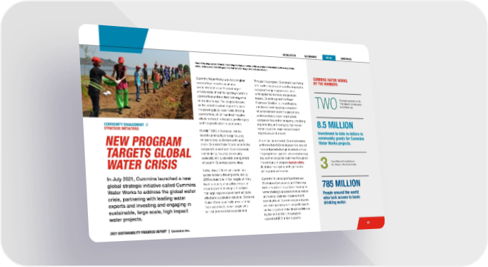 2021 SUSTAINABILITY PROGRESS REPORT | Cummins Inc. COMMUNITY ENGAGEMENT // STRATEGIC INITIATIVES CUMMINS WATER WORKS BY THE NUMBERS TWO 41 Through the program, Cummins is partnering with leading water experts and leveraging the company’s unique experiences, skills and capabilities to make a large-scale impact. Cummins joined the Water Resilience Coalition, a United Nations- sanctioned working group comprised of water-related nonprofit organizations, and more than a dozen major global companies focused on analyzing, prioritizing, implementing and managing high-impact water projects in major water-stressed regions around the world. At a virtual launch event, Cummins leaders and more than 600 employees from around the world provided a high-level look at how the program will operate, while emphasizing key connection points water has throughout the company. A program launch video illustrates the urgency and significance of the global water crisis. Cummins’ initial nonprofit partners are The Nature Conservancy and Water.org, both of which are focused on tackling the water challenge at a basin level as well as at the small business, household and individual level. Cummins regional leaders are working closely with nonprofit experts on five projects in India, Brazil and Mexico. By the end of 2021, the program committed $8.5 million in grants. Cummins Water Works aims to strengthen communities through sustainable water. Water stress is the most urgent environmental threat facing many Cummins communities and is a direct consequence of climate change. The program focuses on the collective action required to solve the growing global water crisis afflicting communities, which has direct negative effects on health, education, gender equity and the growth of entire economies. PLANET 2050 is Cummins’ metrics- based sustainability strategy focusing on operations, customers and supply chain. Cummins Water Works extends the company’s commitment to environmental sustainability, focusing on ensuring availability and sustainable management of water in Cummins communities. Today, about 785 million people lack access to basic drinking water, and by 2050 at least one in four people will likely live in a country affected by chronic or recurring water shortages. A problem this large requires coordinated action to effectuate sustainable solutions. Cummins Water Works specifically aims to bring fresh water to 20 million people who will not otherwise have access to it. NEW PROGRAM TARGETS GLOBAL WATER CRISIS In July 2021, Cummins launched a new global strategic initiative called Cummins Water Works to address the global water crisis, partnering with leading water experts and investing and engaging in sustainable, large scale, high impact water projects. Strategic partners so far, The Nature Conservancy and Water.org. 8.5 MILLION Investment to date in dollars in community grants for Cummins Water Works projects. 3 785 MILLION People around the world who lack access to basic drinking water. Countries with projects so far: Mexico, Brazil and India. Cummins employees in India have long worked on community engagement projects addressing water. Here, employees help villages take better advantage of monsoon season.
