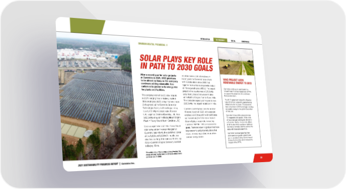 2021 SUSTAINABILITY PROGRESS REPORT | Cummins Inc. India has been a point of emphasis in recent years for Cummins’ solar efforts with 20 installations since 2018 that together have a maximum potential output of 11-megawatts peak (MWp). The largest project in the country was a 1,250 kWp array during phase 2 of a solar initiative at the Kothrud Engine Plant in Pune, India. The total solar capacity at the plant is now 2,800 kWp, the largest installation in India. Cummins currently has plans for another 18 solar projects in 2022, with a special emphasis on China and the United States as the company’s efforts move forward. Solar will play a major role in meeting Cummins’ PLANET 2050 environmental goals. There have been significant technical improvements and price reductions that make it increasingly attractive as a low- carbon energy source. 30 ENVIRONMENTAL PROGRESS // SOLAR PLAYS KEY ROLE IN PATH TO 2030 GOALS After a record year for solar projects at Cummins in 2021, 2022 promises to be almost as busy as the company continues adding renewable, low- carbon solar power to its energy mix for plants and facilities. The company worked on 20 solar projects in 2021, ranging from a relatively modest 36-kilowatt peak (kWp) array that was phase 2 of a project at the Cummins Generator Technologies facility in Ahmednagar, India; to a 1,472 kWp installation atop the new U.K. Logistics Centre in Daventry, U.K.; to a 3,600 kWp array at the Rocky Mount Engine Plant in Rocky Mount, North Carolina (U.S.). When completed in 2022, the Rocky Mount solar array will be the second largest at Cummins, behind only the combined power of the 3,600 and 3,300 kWp installations atop two buildings that make up the Beijing Foton Cummins Engine Company campus in Beijing, China. The solar array at the company’s engine plant in Rocky Mount, North Carolina (U.S.) is expected to come on line in 2022. WIND PROJECT ADDS RENEWABLE ENERGY TO GRID Cummins continues to participate in a Virtual Power Purchase Agreement (VPPA) to support the expansion of a northwest Indiana wind farm. The 2017 agreement helped the Meadow Lake Wind Farm expand by guaranteeing a fixed price for its power. The expansion was completed in 2018 and began sending renewable energy to the grid in December of that year. Cummins’ share of the expansion was 75 megawatts of capacity. While none of the power generated goes directly to a Cummins’ facility, it essentially offsets all of the electricity used from traditional sources at company facilities across the state with renewable electricity. Cummins’ science based facilities- and-operations goal for greenhouse gas is calculated using market-based Scope 2 emissions, which include the impact of the VPPA.