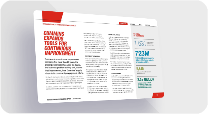2021 SUSTAINABILITY PROGRESS REPORT | Cummins Inc. 1,631 723M Estimated financial impact in dollars of Six Sigma projects at Cummins in 2021. 5,845 Employees achieving Six Sigma belt certifications in 2021. 2.5+ BILLION Estimated savings achieved by Cummins customers from Six Sigma since the tool was first offered to them in 2005. 15 SIX SIGMA BY THE NUMBERS Equity (CARE) initiative. CARE team members have employed Six Sigma to tackle difficult social justice concerns. Over time the company added tools to its tool kit and in 2021 Cummins expanded the Six Sigma function into IQTM—Intelligent Quality Tools and Methods. The company’s IQTM function leads Cummins’ efforts to continuously improve the products and services customers depend on. EXPANDING THE MISSION These tools make Cummins a better company and help the global power leader sustain the improvements it makes to deliver on Cummins’ brand promise of powering customers through innovation and dependability. The company today offers dozens of tools employees can use to define a problem, collect relevant data, analyze the problem and ultimately find a solution. Most tools fit within the Six Sigma umbrella, but now employees have many different options, so they can choose what works best to reach their desired result. Ultimately, the IQTM function’s mission is preparing employees and the company to succeed in the digital age, adding tools and capabilities as they become available. INCREASING ACCESS In addition to expanding the tools the company offers, the IQTM team has been working over the past two years to get more tools in more hands at Cummins, providing on-line learning opportunities and moving away from classroom training, which could be something of a bottleneck as interest in courses frequently exceeded available classroom space. The IQTM team offers tools and processes specifically geared to employees’ skill levels, whether they are an experienced Six Sigma Black Belt or entirely new to the concept. The function is building on a track record of success. The company’s Six Sigma efforts have identified more than $7.5 billion in Profit Before Interest and Taxes savings since the tool was first implemented in 2000. LOOKING AHEAD As the IQTM function moves forward it wants to continue embedding “Lean” business management practices and principles across the company to eliminate waste and increase efficiency, becoming partners with each business segment to improve quality. The IQTM team also wants to help every Cummins employee gain the necessary skills to excel in manufacturing in the digital age. CUMMINS EXPANDS TOOLS FOR CONTINUOUS IMPROVEMENT Cummins is a continuous improvement company. For more than 20 years, the global power leader has used Six Sigma, the business problem solving tool, to drive that improvement, from Cummins’ supply chain to its community engagement efforts. Six Sigma’s data-based analysis is used primarily to identify defects and variation in a wide range of manufacturing and business situations. Cummins also encourages its suppliers to use the tool, and partners with customers to solve their biggest challenges using Six Sigma. In addition, Cummins uses the tool in its efforts to build stronger communities, including as part of its Cummins Advocating for Racial INTELLIGENT QUALITY TOOLS AND METHODS (IQTM) // Closed Six Sigma projects across Cummins in 2021.