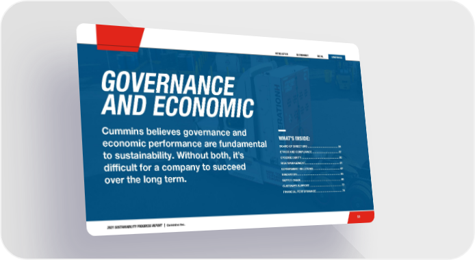 2021 SUSTAINABILITY PROGRESS REPORT | Cummins Inc. 53 GOVERNANCE AND ECONOMIC WHAT’S INSIDE: BOARD OF DIRECTORS ............................................... 54 ETHICS AND COMPLIANCE ......................................... 57 CYBERSECURITY .......................................................... 60 RISK MANAGEMENT ..................................................... 61 GOVERNMENT RELATIONS ......................................... 62 INNOVATION .................................................................. 65 SUPPLY CHAIN .............................................................. 69 CUSTOMER SUPPORT ................................................. 72 FINANCIAL PERFORMANCE ........................................ 74 Cummins believes governance and economic performance are fundamental to sustainability. Without both, it’s difficult for a company to succeed over the long term.
