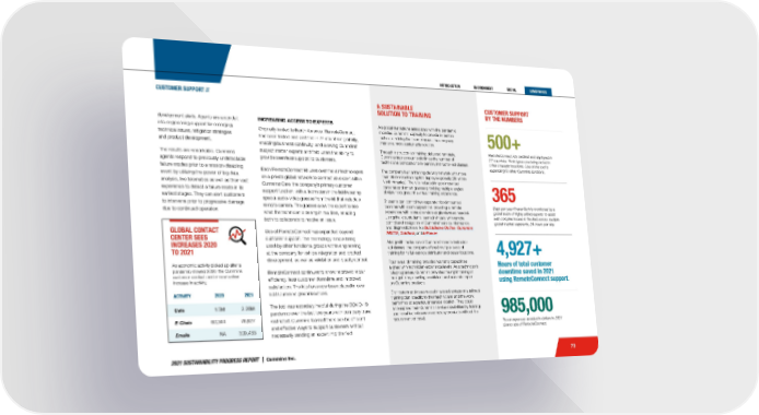 73 ACTIVITY 2020 2021 Calls 1.5M 2.26M E-Chats 60,344 76,627 Emails NA 309,433 GLOBAL CONTACT CENTER SEES INCREASES 2020 TO 2021 As economic activity picked up after a pandemic-slowed 2020, the Cummins customer contact center saw a clear increase in activity. INCREASING ACCESS TO EXPERTS Originally limited to North America, RemoteConnect has been tested and certified in 27 countries globally, enabling business continuity, and allowing Cummins’ subject matter experts and field users the ability to provide seamless support to customers. Each RemoteConnect kit uses over-the-air technologies on a private global network to connect an expert within Cummins Care, the company’s primary customer support function, with a technician in the field wearing special audio-video glasses from the kit that include a remote camera. The glasses allow the expert to see what the technician is seeing in real time, enabling both to collaborate to resolve an issue. Use of RemoteConnect has expanded beyond customer support. The technology is now being used by other functional groups within engineering at the company for vehicle integration and product development, as well as validation and quality control. RemoteConnect continues to show improved repair efficiency, less customer downtime and improved satisfaction. The kits have now been placed in over 500 Cummins global locations. The tool was especially helpful during the COVID-19 pandemic over the last two years with company travel restricted. Cummins learned there can be efficient and effective ways to support customers without necessarily sending an expert into the field. CUSTOMER SUPPORT // A SUSTAINABLE SOLUTION TO TRAINING As global restrictions associated with the pandemic impeded Cummins’ capacity to provide in-person technical training for its employees, the company created a more sustainable solution. Through instructor-led training delivered remotely, Cummins trained four to six times the number of technicians compared to in-person, instructor-led classes. The company built a training delivery network with more than 59 remote training kits deployed globally (28 within North America). The kits included tri-pod mounted cameras and smart glasses providing multiple angles of view throughout the virtual training experience. Students can control two separate tripod mounted cameras with zoom capabilities providing a remote experience with close and wide-angle views as needed. Using the kits, students learned virtually with remote control and navigation of Cummins’ service information and diagnostic tools like QuickServe Online , Cummins INSITE , Guidanz , and InPower . Along with the launch of Cummins’ remote instructor led classes, the company offered multiple levels of training for its full-service distributor and dealer locations. Four levels of training provided warranty capabilities aligned with technician-experience levels. As a technician’s role progresses, Cummins provided the right training at the right time, enabling an efficient and accurate repair on Cummins products. Distributors and dealers could take advantage of a tailored training plan specific to their technicians and the work performed at a particular service location. They could also expand their Cummins service capabilities by training additional technicians on company products without the requirement of travel. CUSTOMER SUPPORT BY THE NUMBERS 985,000 Travel expenses avoided in dollars in 2021 due to use of RemoteConnect. 4,927+ Hours of total customer downtime saved in 2021 using RemoteConnect support. 365 Days per year PrevenTech is monitored by a global team of highly skilled experts to assist with complex issues in the field across multiple global market segments, 24-hours per day. 500+ RemoteConnect kits certified and deployed in 27 countries. Prototypes are being tested in other strategic locations. Use of the tool is expanding to other Cummins functions. development alerts. Agents are a conduit into engineering support for emerging technical issues, mitigation strategies and product development. The results are remarkable. Cummins agents respond to previously undetectable failure modes prior to a mission-disabling event by utilizing the power of big data analysis, live telematics as well as their vast experience to detect a failure mode in its earliest stages. They can alert customers to intervene prior to progressive damage due to continued operation. 2021 SUSTAINABILITY PROGRESS REPORT | Cummins Inc.