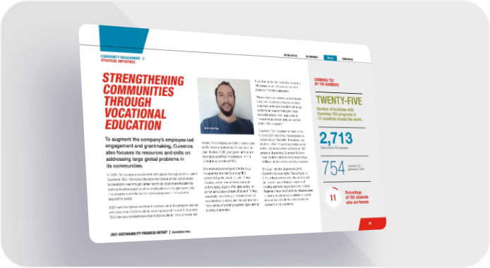 2021 SUSTAINABILITY PROGRESS REPORT | Cummins Inc. CUMMINS TEC BY THE NUMBERS 38 He is thankful for his time in the Cummins TEC program and the connections he’s made with former classmates. “Some friends are working as technicians, some continued their education and are engineers, and some decided that being a technician was not their path. Most have related jobs now, largely due to the technical and soft skills we learned in the (TEC) program.” Cummins TEC increased its reach in the U.S. in 2021, launching new programs at two schools in Nashville, Tennessee, one of which is the first post-secondary school in the U.S. to implement a Cummins TEC program. Expanding Cummins TEC into these locations aims to improve pathways for Black students into prosperous careers. This goal links the program to CARE: Cummins Advocating for Racial Equity, a U.S. strategic community initiative focused on dismantling institutional racism and creating systemic equity launched in 2020. Together, these two Cummins initiatives seek to strengthen programs available to people of color and provide the skills needed to compete in the workforce. female. The company aspired to reach a goal of 8% female enrollment in TEC schools last year. To date, 2,713 young men and women have graduated from the program, with a total graduation rate of 78%. One such success story is Mert Karakus. He attended the first Cummins TEC cohort at Ege University in Izmir, Turkey, focusing on the mechatronics curricula and studying English. After graduation, he joined aerospace company Fokker in Turkey, eventually transferring to Toronto where he manufactures and supplies wiring harnesses for a variety of aircraft programs, specializing in Airbus harnesses. STRENGTHENING COMMUNITIES THROUGH VOCATIONAL EDUCATION To augment the company’s employee-led engagement and grantmaking, Cummins also focuses its resources and skills on addressing large global problems in its communities. In 2012, the company launched its first global strategic initiative called Cummins TEC: Technical Education for Communities, which seeks to transform lives through career technical vocational education by training disadvantaged youth in employable skills to gain good jobs. The program currently has 25 school programs in 12 countries around the world. 2021 saw the highest enrollment numbers since the program started, with more than 1,200 students enrolling around the world. Cummins TEC has now enrolled more than 6,100 students, 11% of whom are COMMUNITY ENGAGEMENT // STRATEGIC INITIATIVES 2,713 Total Cummins TEC graduates. TWENTY-FIVE Number of locations with Cummins TEC programs in 12 countries around the world. 11 Percentage of TEC students who are female 754 Cummins TEC graduates in 2021. Mert Karakus