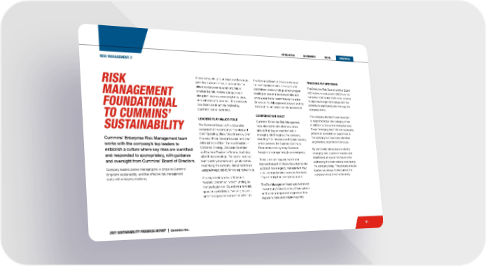 2021 SUSTAINABILITY PROGRESS REPORT | Cummins Inc. 61 TRACKING FUTURE RISKS The Executive Risk Council and the Board of Directors re-evaluated in 2020 how the company traditionally tracks risks, seeking to also track longer-term issues with the potential to significantly alter the way the company works. The company decided it was important to begin tracking a new category of risk in addition to the current enterprise risks. These “emerging risks” did not necessarily present an immediate or large threat to the company but have been identified as potentially important in the future. By continually taking steps to identify emerging risks, Cummins’ leaders and board keep an eye on the future while addressing the most material risks facing the company today. This process ensures leaders are always thinking about the company’s long-term sustainability. The Cummins Board of Directors oversees the most significant risks. The board or its committees receive briefings at every regular meeting on one or more relevant risks and once a year the full board reviews the entire Enterprise Risk Management program and the results of the last enterprise risk assessment. COORDINATION IS KEY Cummins’ Enterprise Risk Management team also works with other assurance groups that play an important role in managing risk throughout the company, including Risk Insurance and Global Security, which oversees the Business Continuity Plans established by every Cummins location to manage through an emergency. These plans are regularly tested and improved as part of Global Security’s holistic approach to emergency management. Key sites undergo tabletop exercises to ensure they are ready if an emergency occurs. The Risk Management team also works with the company’s Area Business Organizations on the risk management programs in their regions to track and mitigate key risks. A company’s ability to anticipate and manage potential business interruptions can be the difference between success and failure, whether the risk involves a supply chain disruption, an emissions compliance issue, or a cybersecurity concern—three of nearly two-dozen areas actively tracked by Cummins’ senior leadership. LEADERS PLAY MAJOR ROLE The Cummins Executive Risk Council is comprised of the company’s President and Chief Operating Officer, Vice Chairman, Chief Financial Officer, General Counsel, and Chief Administrative Officer. The Vice President – Corporate Strategy, Corporate Controller and the Vice President of Internal Audit also attend these meetings. The council meets at least quarterly to review and update material risks facing the company. Senior leaders are assigned responsibility for managing key risks. At every meeting a few of these risk “owners” present an in-depth briefing on their particular risk. Council members ask questions and debate the risk to ensure it gets the appropriate amount of attention. RISK MANAGEMENT FOUNDATIONAL TO CUMMINS’ SUSTAINABILITY Cummins’ Enterprise Risk Management team works with the company’s top leaders to establish a culture where key risks are identified and responded to appropriately, with guidance and oversight from Cummins’ Board of Directors. Company leaders believe managing risk is critical to Cummins’ long-term sustainability, and that effective risk management starts with enterprise resiliency. RISK MANAGEMENT //